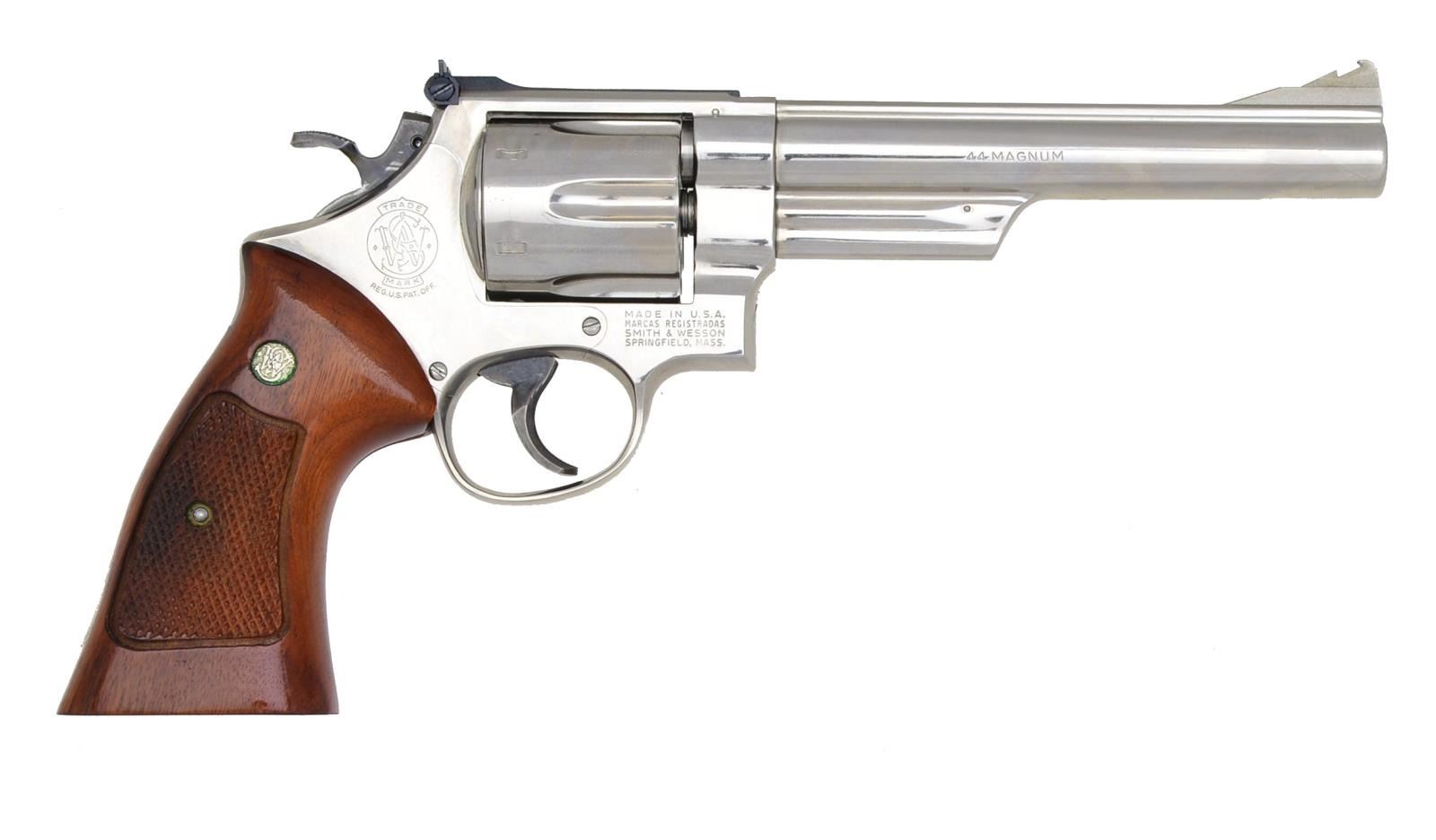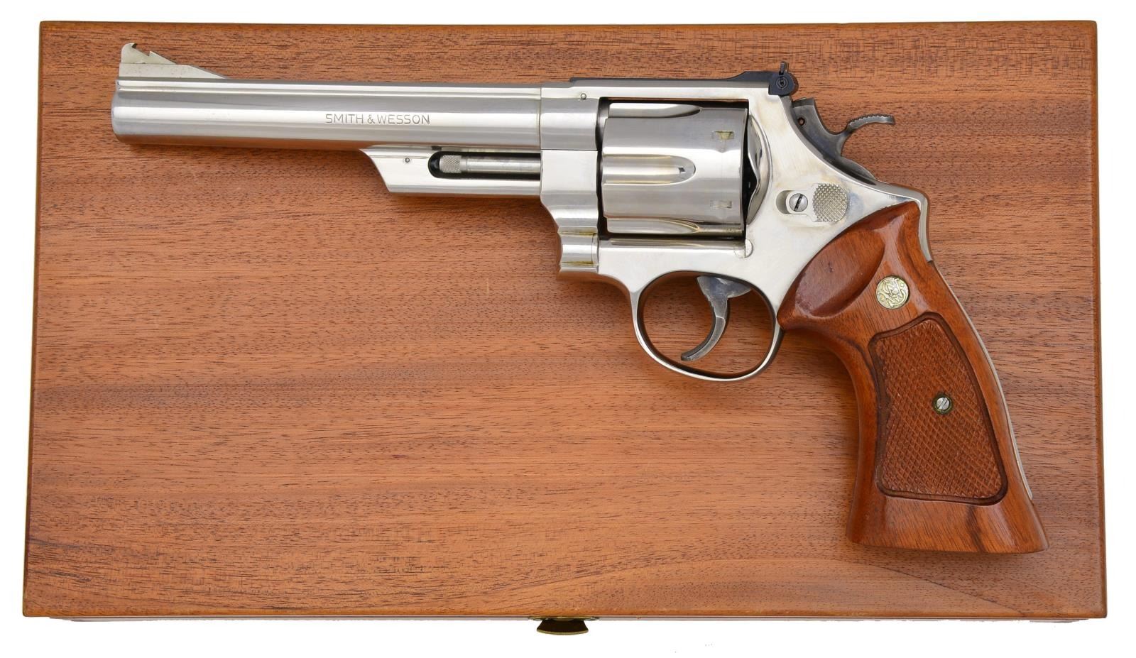 Cal. 44 Mag. S# N387535. Bbl. 6 1/2" w/ rib. Serrated ramp front sight & white outline square notch adj. rear sight. 6 Shot fluted cyl. Pinned bbl., 3 screw action. Nickel finish w/ case colored target hammer & target trigger. 2 Piece checkered Goncalo Alves target grips. UNATTACHED ACCESSORIES: presentation case containing instructions. CONDITION: over 98% metal finish showing a cyl. drag line. Front sight insert is missing. Grips show few sm. marks w/ spot of dark staining on checkering on right panel. Bright near excellent bore. (20-3238/DS). MODERN. $1,000-1,500.