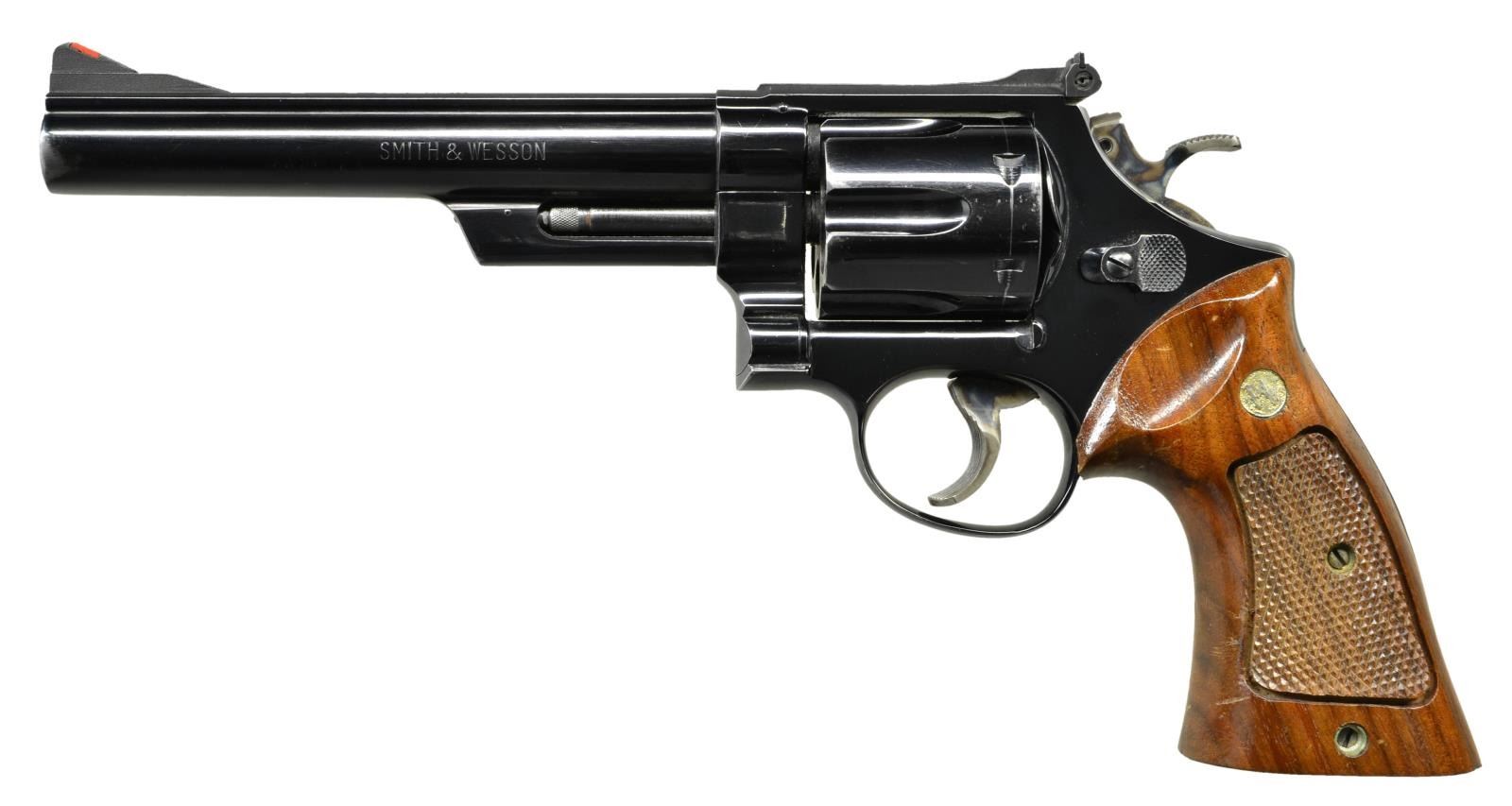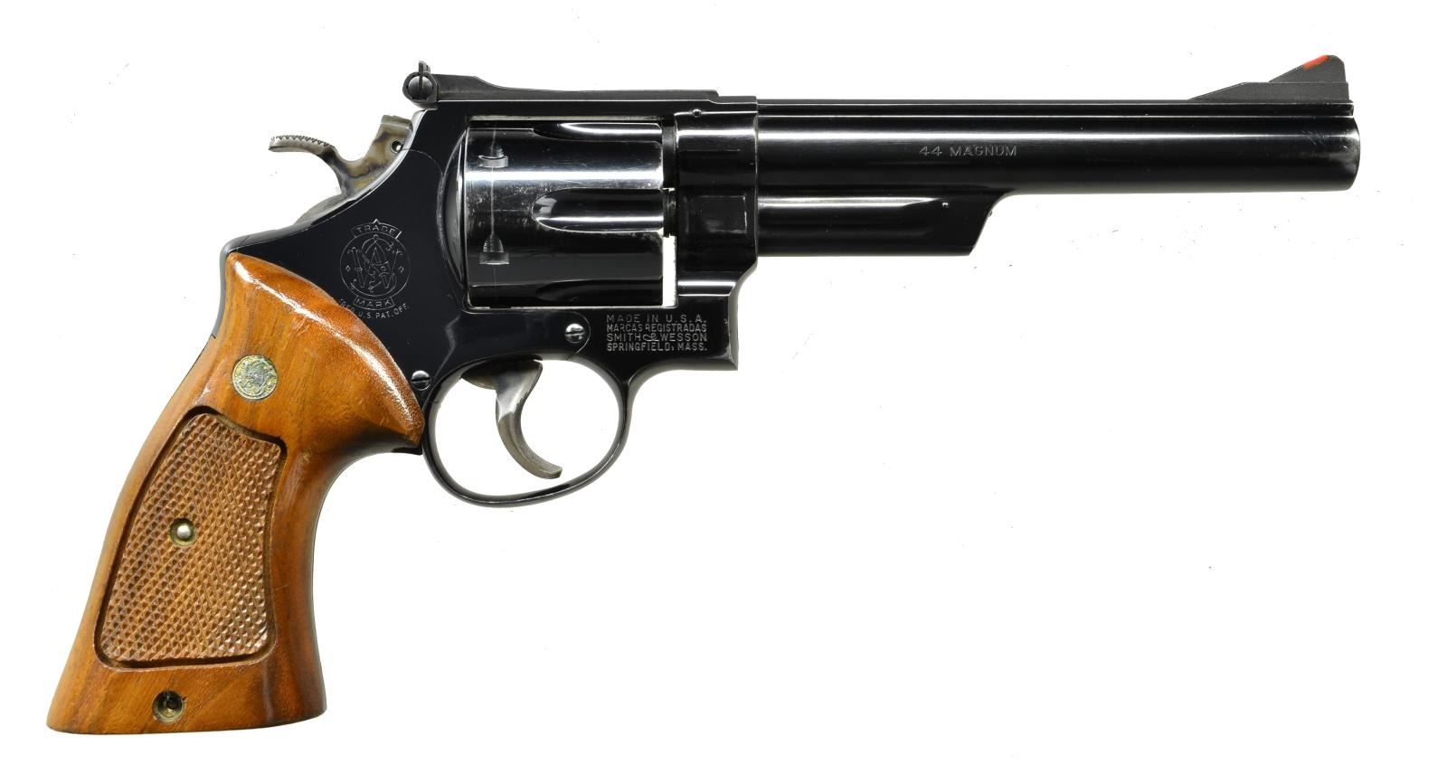 Cal. 44 Mag. S# S270535. Bbl. 6 1/2". Ramped serrated front sight w/ red insert. Adj. square notch rear sight w/ white outline. Blued finish w/ case colored target hammer & trigger. Checkered target grips w/ silver S&W medallions & two screws. CONDITION: right grip panel has a notable chip at front, right panel has a smaller chip & back of right panel has small crack. Grips otherwise show some flaking varnish, dings & handling marks. Hammer & trigger retain most of their case colors w/ some operational wear. Balance of metal retains 92% original blue w/ a drag line on cyl., scattered wear on cyl. & high edge wear. Very good plus bore. (22-4654/MJC). CURIO. $700-1100.