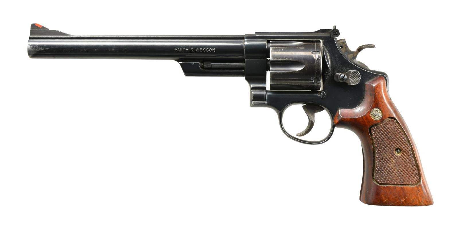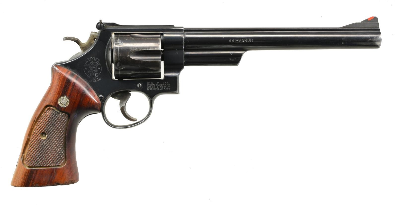 Cal. 44 Mag. S# AJM3285. Bbl. 8 3/8" w/ shrouded ejector, rib & red ramp front sight. White outline adj. rear sight. 6 Shot fluted cyl. Blue finish 3 screw action. w case colored target hammer & trigger. 2 Piece Goncalo Alves checkered target grips. CONDITION: 70% lightly worn blue showing muzzle & edge wear w/ cyl. drag line & spots of corrosion. Grips show wear & handling marks w/ sm. chips around butt. Bore retains strong rifling. (20-2691/DS). MODERN. $500-800.