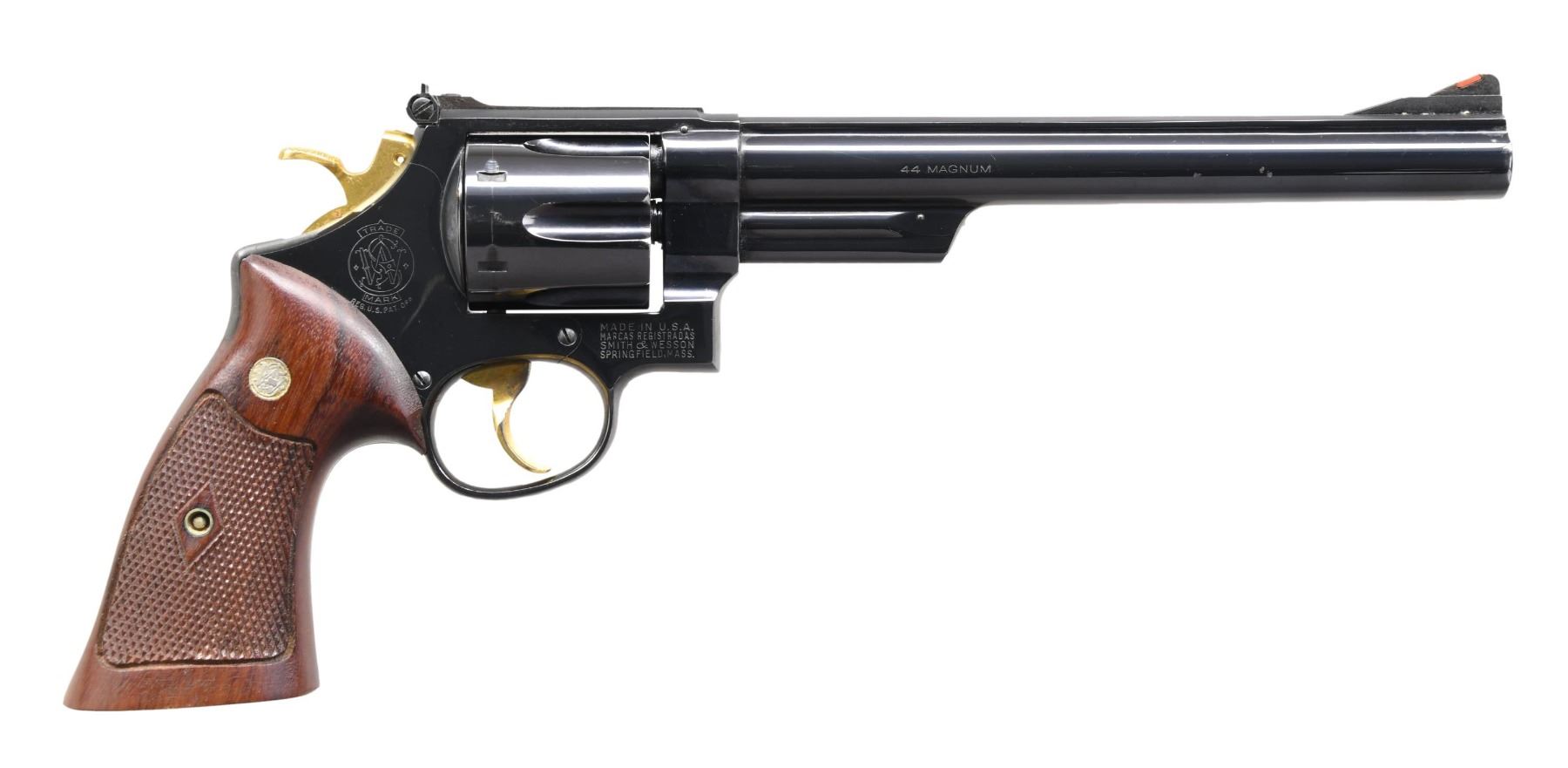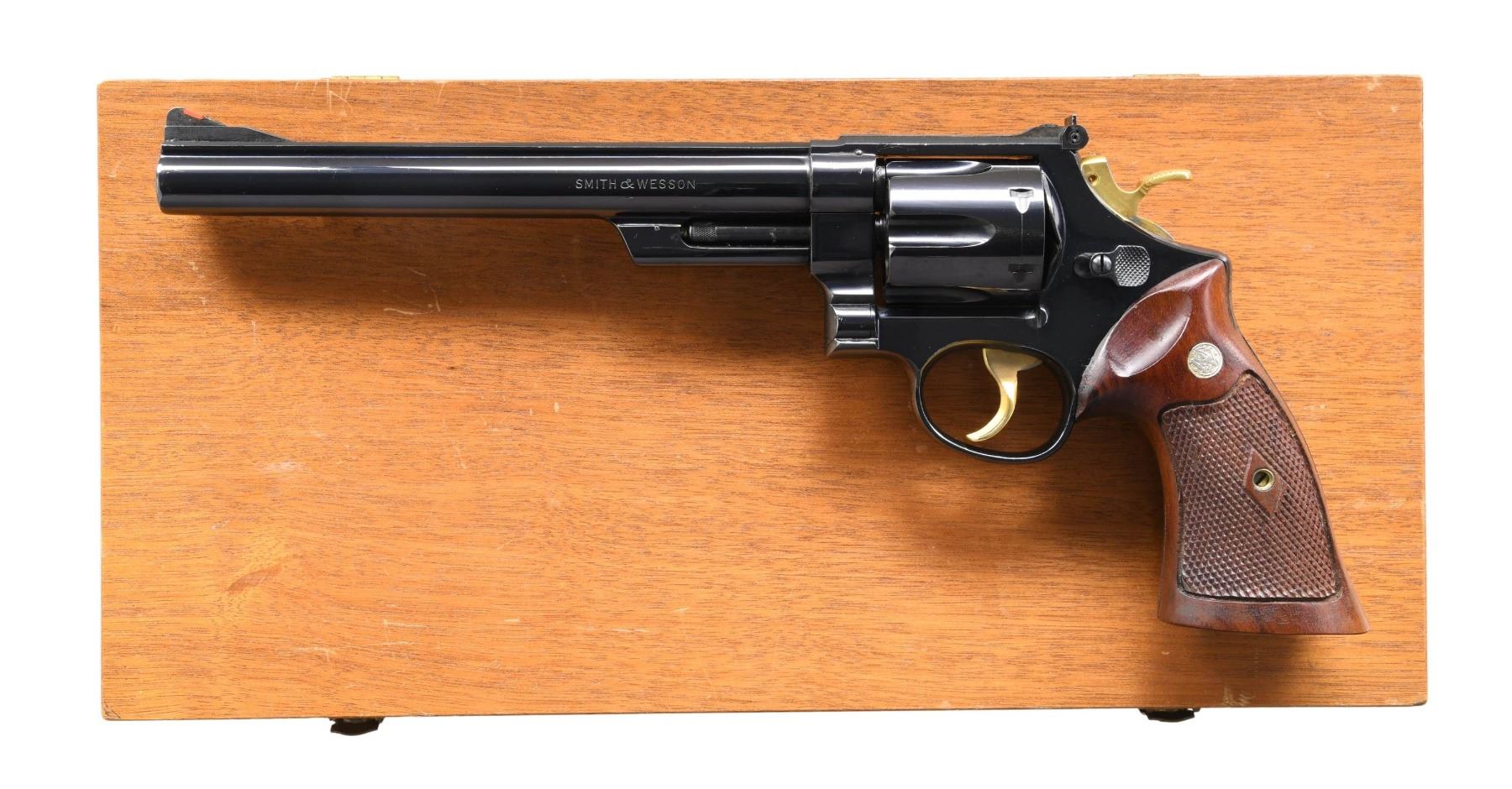Cal. 44 Mag. S# S184615. Bbl. 8 3/8", pinned. Ramped, serrated blade front sight with orange insert. Adjustable, square-notch rear sight with white outline. Early, no-dash Model 29 revolver, mfg. 1958-1959. Rear of the cyl. is matching-numbered to the grip frame. Blued finish with gold-plated target trigger and hammer. Checkered walnut target grips with silver S&W medallions. UNATTACHED ACCESSORIES: display case with screwdriver, cleaning rod, and two brushes. Inside the display case shows some staining and notable wear. CONDITION: grips show some light handling marks. Trigger and hammer retain much of their replated gold finish with some light flaking. Balance of metal retains 92% blue with a drag line on the cyl., a few light scratches, some high-edge staining, and wear. Action functions properly when hand-cycled. Very good+, bright bore. (24-4036/MJC). CURIO. $800-1,200.