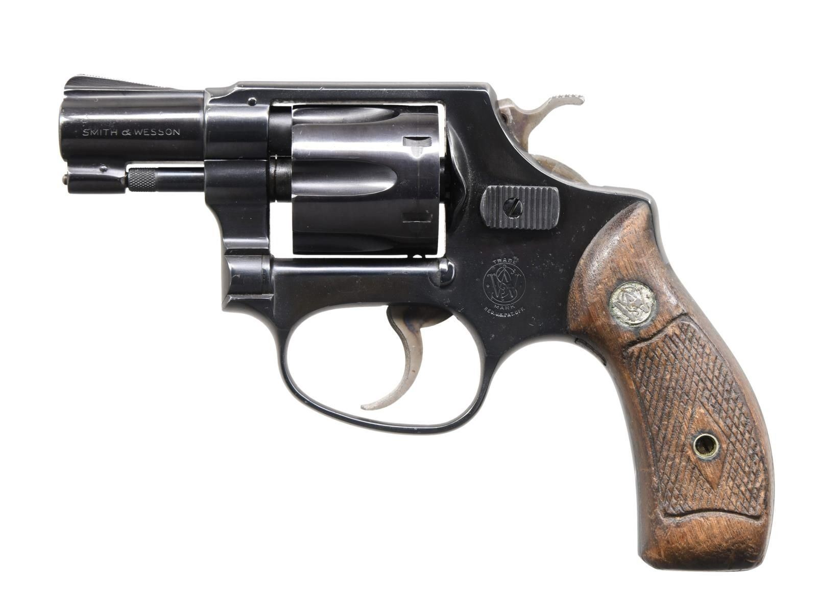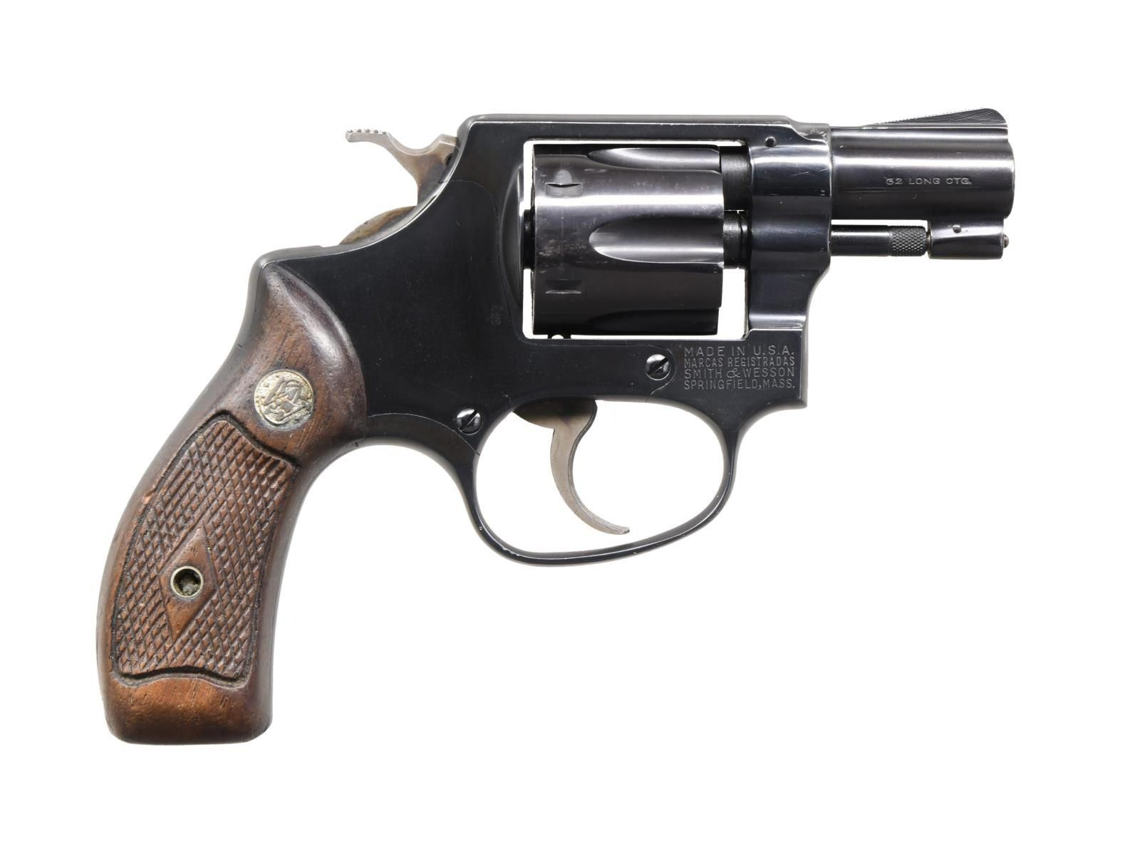 Cal. 32 S&W Long. S# 683507. Bbl. 2". Serrated ramped blade front sight. Fixed rear sight. Mfg. 1957-61. Blue finish w/ case colored trigger & hammer. Flat cyl. latch. Checkered magna grips w/ silver S&W medallions. CONDITION: grips show heavy handling wear w/ some flaking, dings & handling marks. Trigger & hammer retain nearly all of their case colors w/ some light oxidation & operational wear. Balance of metal retains 90% of a reblue w/ some pitting beneath the finish, scattered fading to brown & some operational wear. Very good bright bore. PROVENANCE: The Collection of Gun Sport Ltd owned by Jon R. Thomas. (23-4223/MJC). CURIO. $350-550.