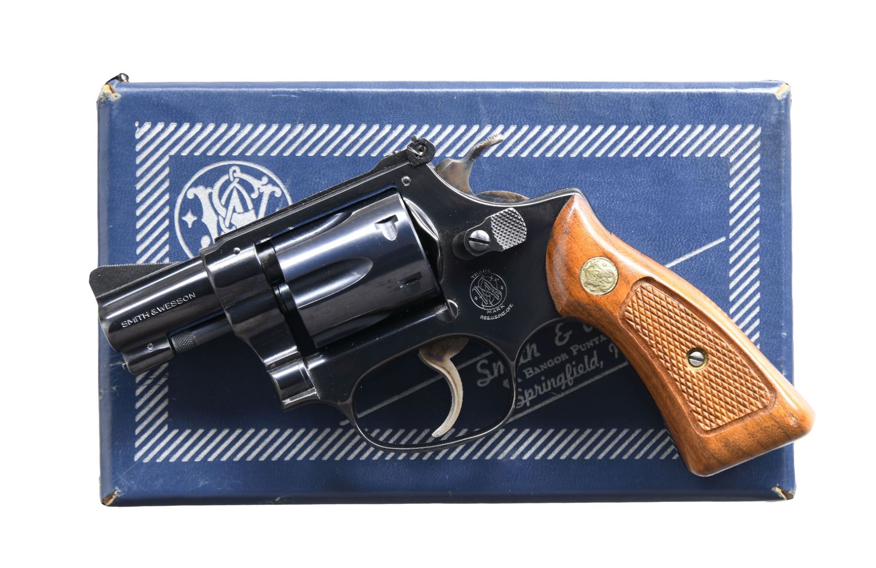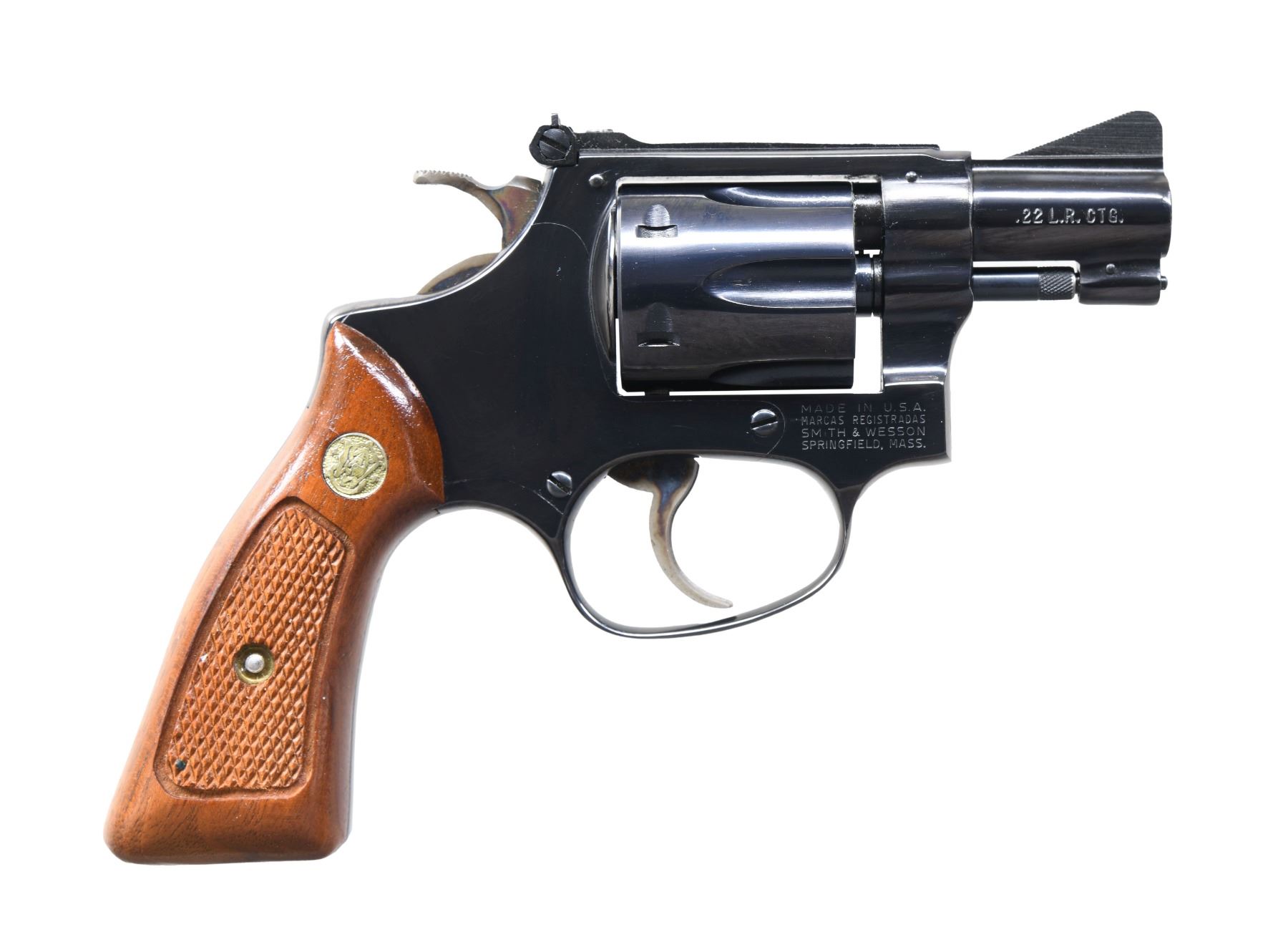 Cal. 22 LR. S# M101655. Bbl. 2" pinned. Ramped serrated blade front sight. Adjustable square notch rear sight. Mfg. 1978. Blued finish with case colored trigger & hammer. Checkered walnut grips with matching numbered right panel & silver S&W medallions. UNATTACHED ACCESSORIES: matching numbered factory box with manual, paperwork, screwdriver & cleaning kit. CONDITION: left grip panel shows a very small light ding at bottom, grips otherwise near excellent. Trigger & hammer retain nearly all their case colors with some minor operational wear. Balance of metal retains 99% original blue with some minor wear around left upper rear sideplate screw. Action functions properly when hand cycled. Bright near excellent bore that appears to have been seen little if any use. PROVENANCE: From the Lifelong Collection of George Staden S&W Member #3451. (25-129/MJC). MODERN. $700-1100.