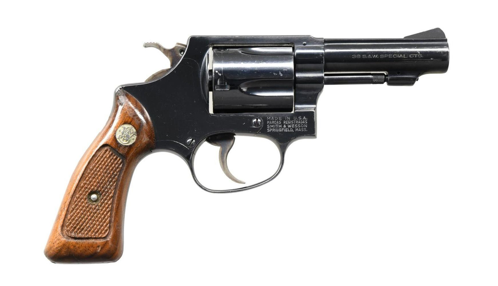 Cal. 38 SPL. S# J739383. Bbl. 3". Model 36-1 double action revolver mfg. by Smith & Wesson. The left side of the bbl. is marked "SMITH & WESSON", with the cal. designation marked on the right. Left side of frame exhibits the S&W trademark logo, with S&W's mfg. information on the right. Frame, cyl., and bbl. exhibit a blued finish, with the trigger and hammer exhibiting a case color hardened finish. Frame is mounted with 2-piece S&W medallion checkered wood grips, with the right grip panel exhibiting a matching S# (minus the "J" suffix" on the interior. Serrated ramp front sight with frame notched rear sight. CONDITION: metal components retain the majority of their original factory blue finish, exhibiting a couple small spots of mild wear, and superficial marks from handling and storage overall. Cyl. bears a light dragline. Mirror bore, exhibiting well defined rifling throughout. Grips exhibit a few scattered marks and dings, but otherwise remain sturdy and serviceable. (23-5249/MLW). MODERN. $400-600.