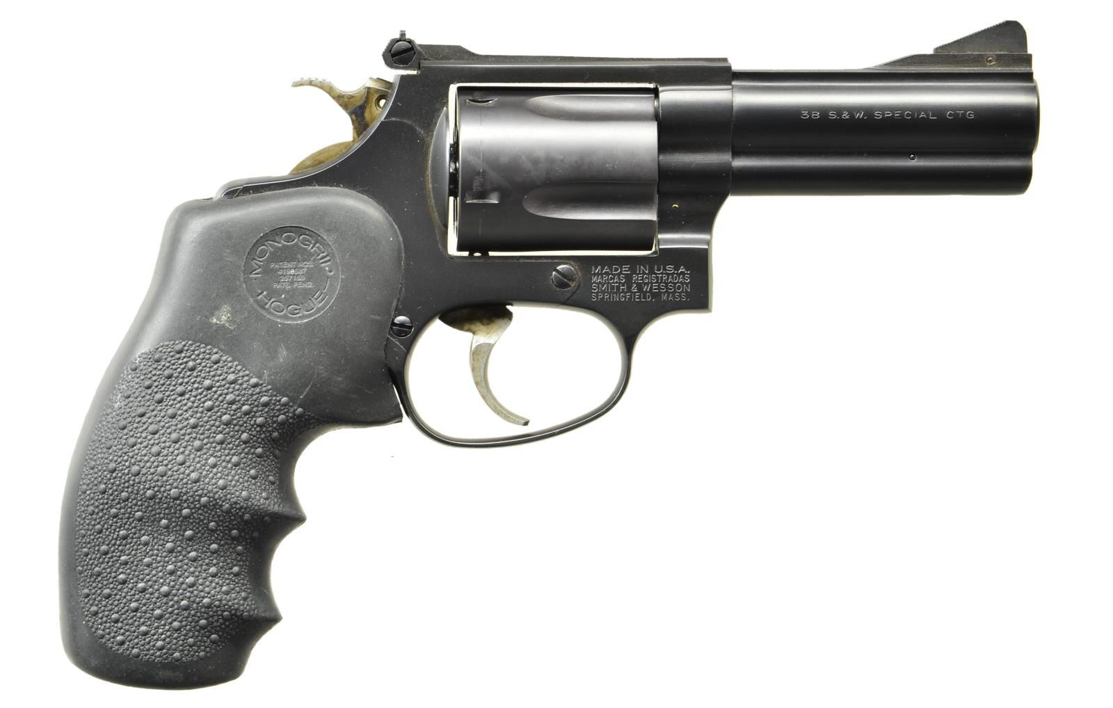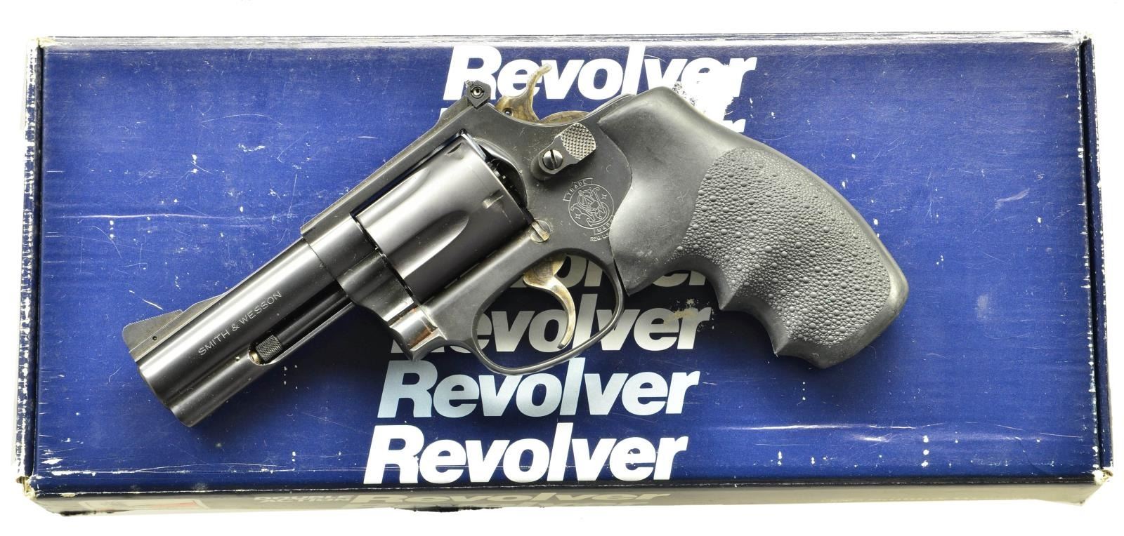 Cal. 38 Spl. S#BEA9556. Bbl 3" w/ full lug & rib. Pinned serrated front sight. Square notch adj. rear sight. 5 shot cyl. Case colored hammer & trigger. Matte finish. 1 piece Hogue finger groove grip. Special production mfg. 1989 w/ total production of 615 guns. UNATTACHED ACCESSORIES: original box end labeled to gun & cleaning rod. CONDITION: grip screw shows slot damage. Grips show light staining & handling marks. Hammer & trigger show faded case colors from operation. Metal retains 97% original matte finish w/ light cyl. drag line. Near excellent bore. (22-3558/MJC). MODERN. $600-800.