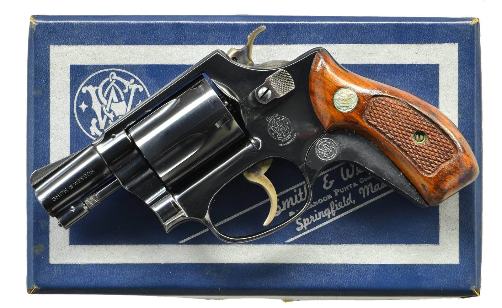 Cal.38 S&W Spl. S# 722661 Bbl. 2". Mfg.1969. Traditional double action. 5-shot fluted cylinder. Serrated black front ramp sight w/ notch rear. Serrated trigger. Checkered hammer spur & cylinder release. Walnut checkered grips w/ S&W medallion. Plastic grip spacer attached to frontstrap, rear of trigger guard. UNATTACHED ACCESSORIES: Numbered blue, factory box, tools & paperwork. CONDITION: All aspects appear as new aside from a very light drag line & a few spots of extremely light thinning on the cylinder. Grips illustrate only a few extremely light impressions. Bright bore w/ strong rifling. (22-3567/JZ). CURIO. $350-550