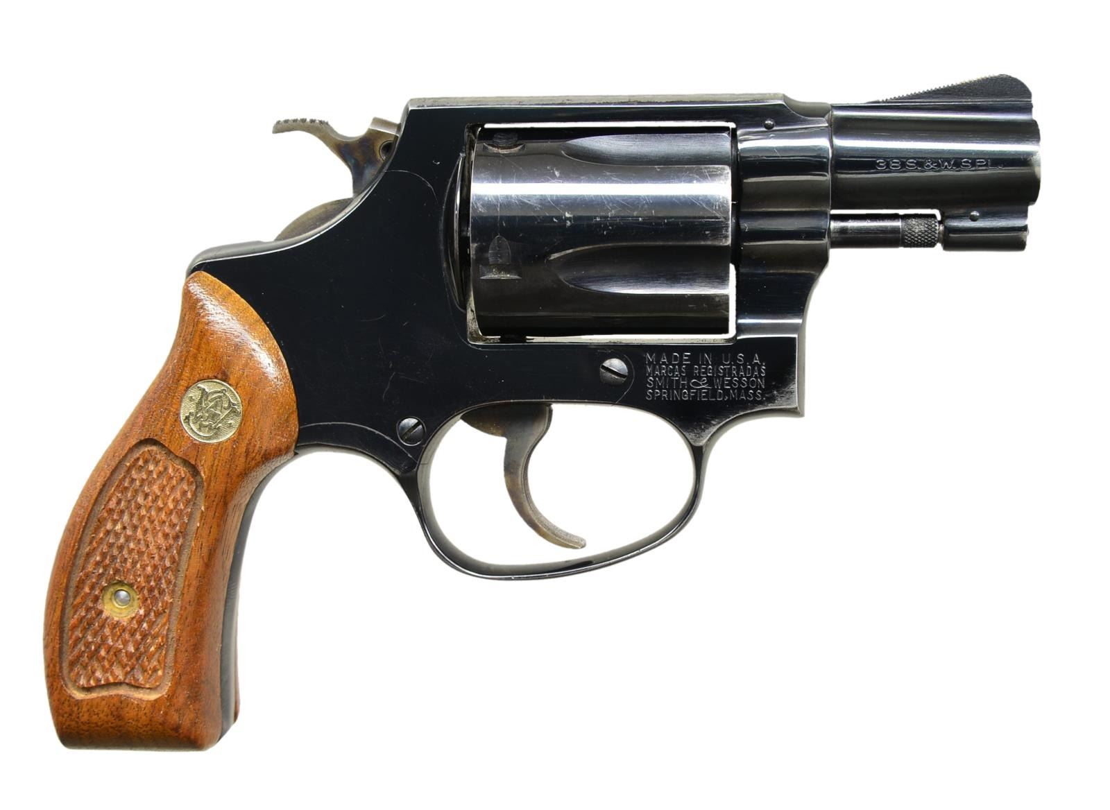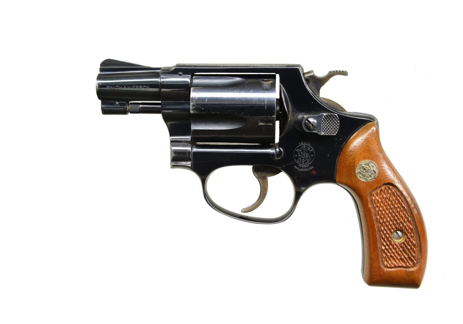 Cal. 38 Spl. S# 756566. Bbl. 1 7/8" w/ rib & serrated ramp front sight. 5 Shot swing out cyl. J Frame 3 screw action w/ pinned bbl. Blue finish w/ case colored hammer & trigger. 2 Piece checkered walnut rnd. butt Magna grips w/ S&W medallions. CONDITION: over 85% blue showing edge & carry wear w/ cyl. drag line & scattered marks. Upper portion of front sight has serrations removed w/ bright finish. Grips show light wear. bore shows scattered pitting. (21-3775/DS). MODERN. $350-500.