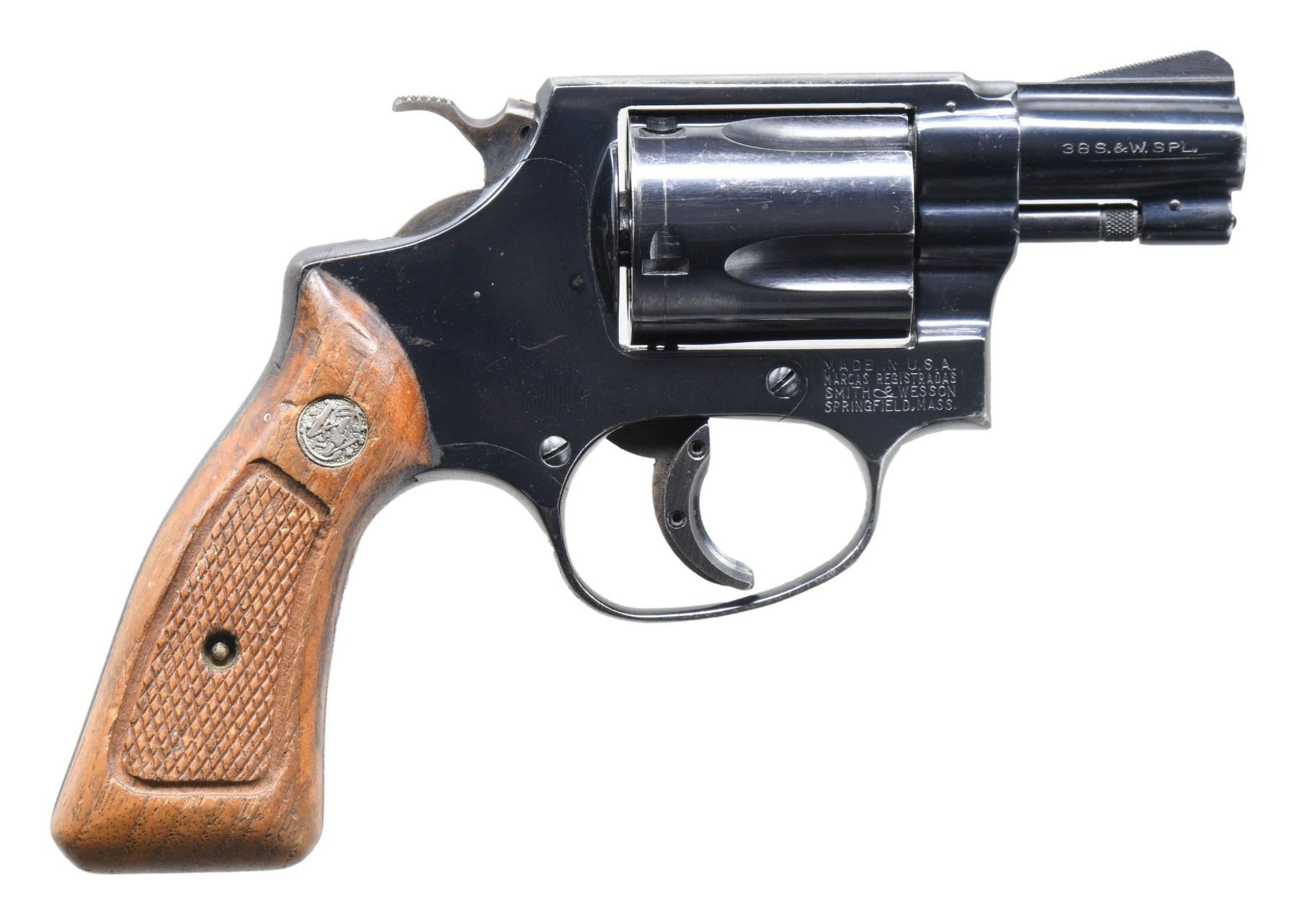 Cal. 38 Spl. S# J2788. Bbl. 2" pinned. Ramped serrated blade front sight. Fixed rear sight. No-dash Model 36 revolver made in 1969. 5-shot cyl. Blued finish with case colored hammer & trigger. Trigger shoe present. Checkered walnut grips with matching numbered right panel & silver S&W medallions. CONDITION: grips show staining, handling marks & a shallow chip on right panel behind checkering. Hammer & trigger show overall fading to gray with strong amounts of case colors. Balance of metal retains 80% original blue with scattered flaking to brown mostly on straps & high edges, some edge wear, handling marks & a turn-line on cyl. Action functions properly when hand cycled. Bright near excellent bore. (25-5127/MJC). CURIO. $450-650.