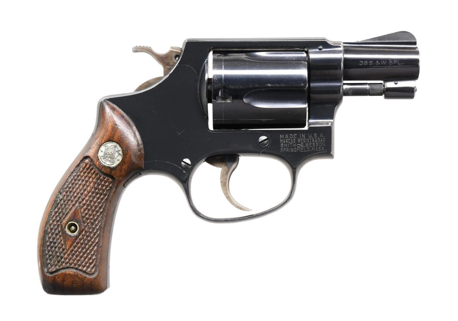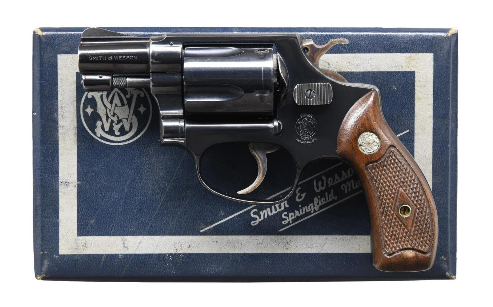 WITH MATCHING BOX. Cal. 38 SPL. S# 272831. Bbl. 1 7/8". Model 36 double action revolver mfg. by Smith & Wesson. The left side of the bbl. is stamped "SMITH & WESSON", with the cal. designation marked on the right. Left side of frame exhibits the S&W trademark logo, with S&W's mfg. information on the right. Frame, cyl., and bbl. exhibit a blued finish, with the trigger and hammer exhibiting a case color hardened finish. Frame is mounted with 2-piece S&W medallion checkered wood grips, with the right grip exhibiting a matching S# that is stamped on the interior of the panel. UNATTACHED ACCESSORIES: matching factory box containing an S&W warranty card and cleaning tools. CONDITION: metal components retain the majority of their original factory blue finish, exhibiting a few spots of light wear and some superficial handling marks overall. Mirror bore, exhibiting well defined rifling throughout. Grips show some scattered marks and minor impressions, but otherwise are good overall. Box exhibits some exterior wear, but otherwise remains sturdy and serviceable. (23-5215/MLW). CURIO. $400-600.
