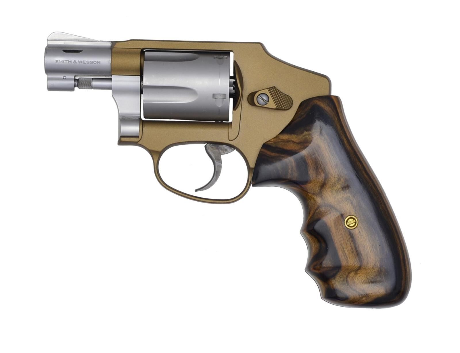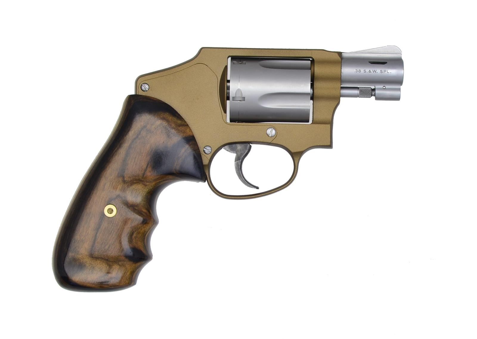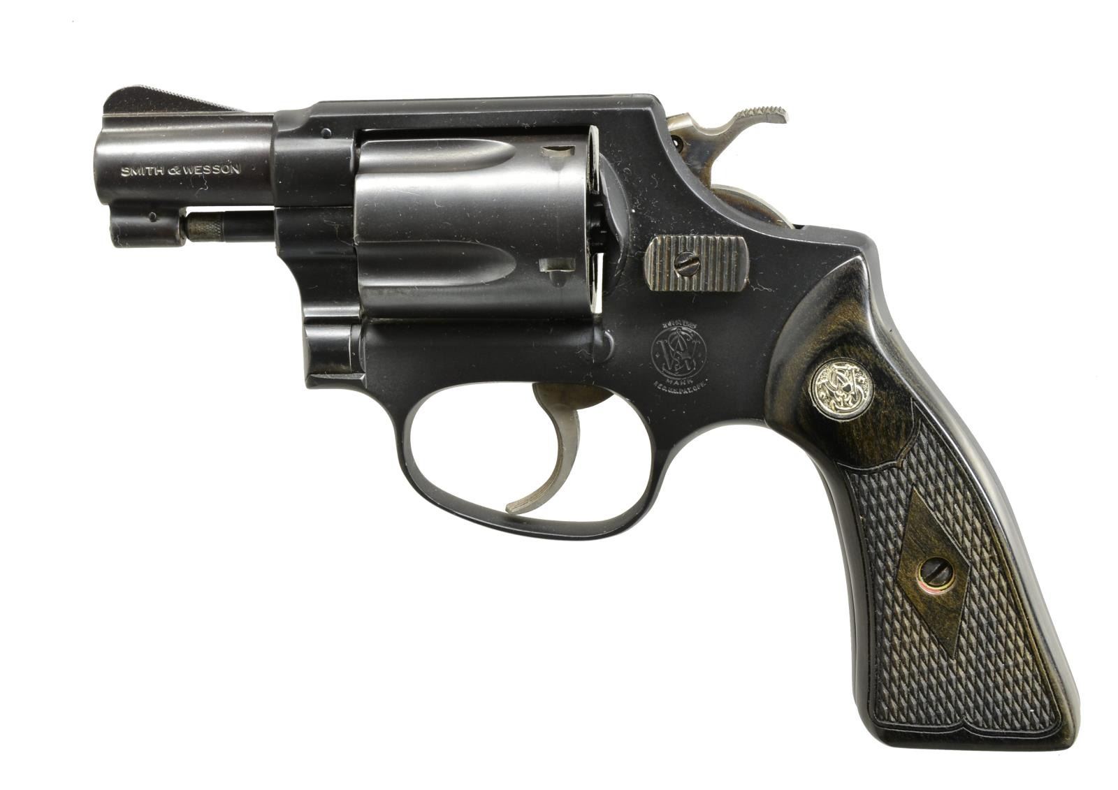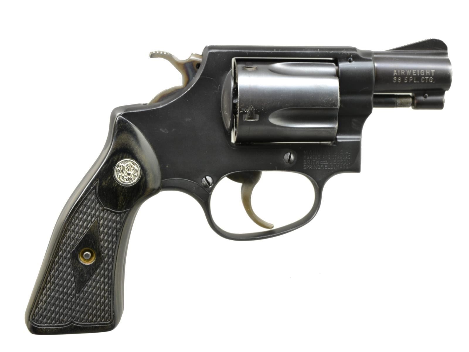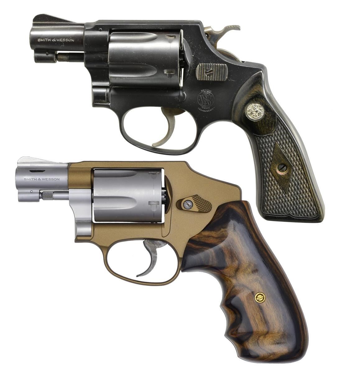 REVOLVER. ALL: cal. 38 Spl. 1) MODEL 37 AIRWEIGHT. S# 176614. Bbl. 2" w/ serrated ramp front sight. 5 Shot steel cyl. Pinned bbl. w/ 3 screw alloy frame. Case colored hammer & trigger. Green/gray laminated Magna style grips w/ diamond checkering & S&W medallions. CONDITION: bbl. & cyl. retain 98% matte reblued finish. Frame has flat black refinish. Very good grips. Bore retains sound rifling w/ sm. spot of pitting. (20-3676/DS). 2) MODEL 642-1 CENTENNIAL AIRWEIGHT. S# CBU3124. Bbl. 2" ported w/ serrated ramp front sight. 5 Shot fluted steel cyl. Gold finished alloy 3 Screw frame w/ concealed hammer. Bbl., crane & cyl. have matte silver finish. Laminated square butt combat grips. CONDITION: 98% metal finish showing sm. handling marks & light cyl. drag line. Bright near excellent bore. (20-3682/DS). ALL MODERN. $600-900.