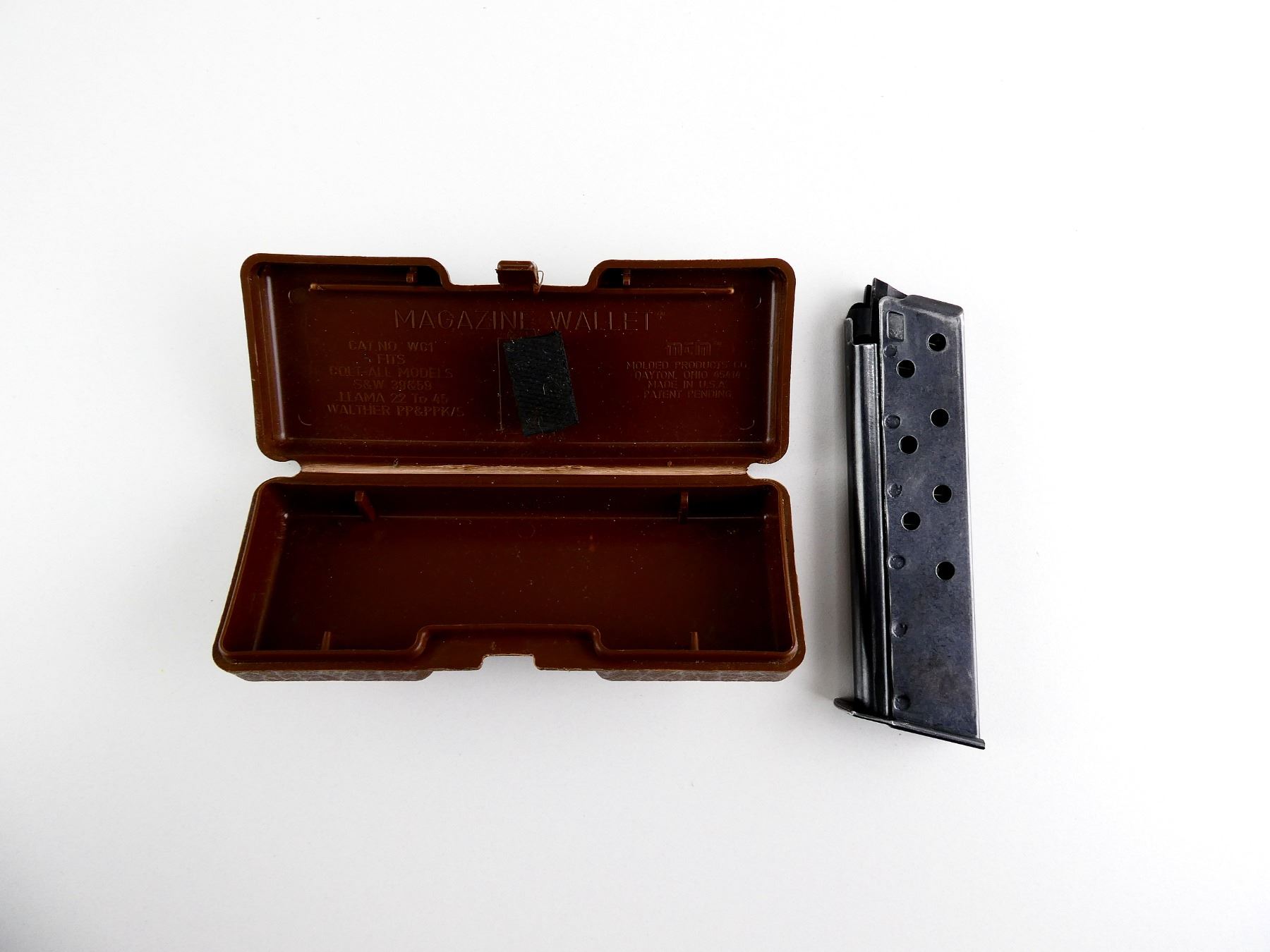 (1) 9MM LUGER MAG, 8 RNDS, BLUED STEEL, BASE MARKED: "S&W", WITH PLASTIC CARRYING CASE. SEE PHOTOS. PAL REQUIRED.
