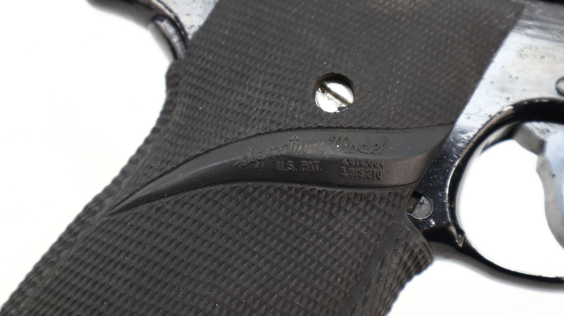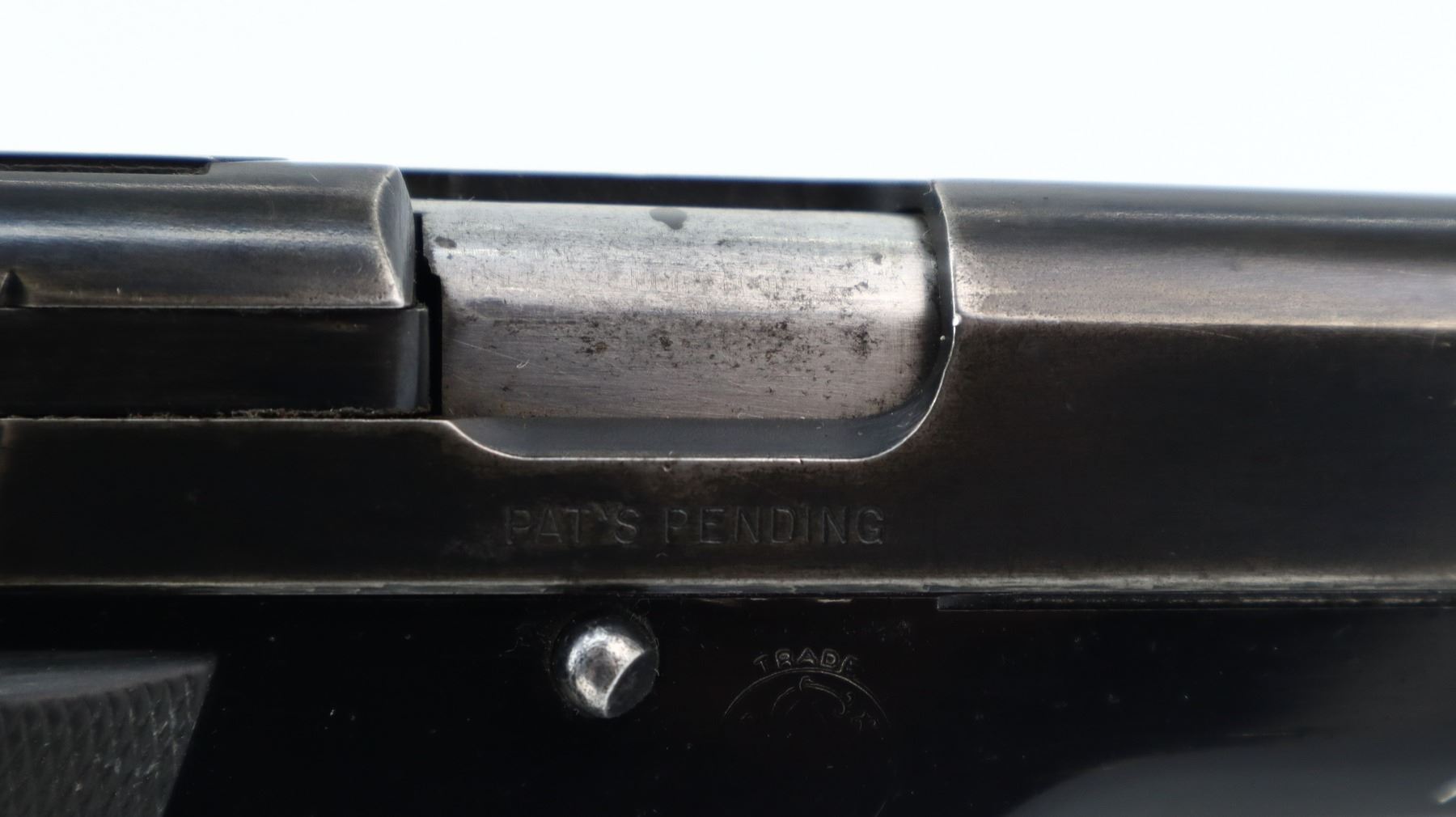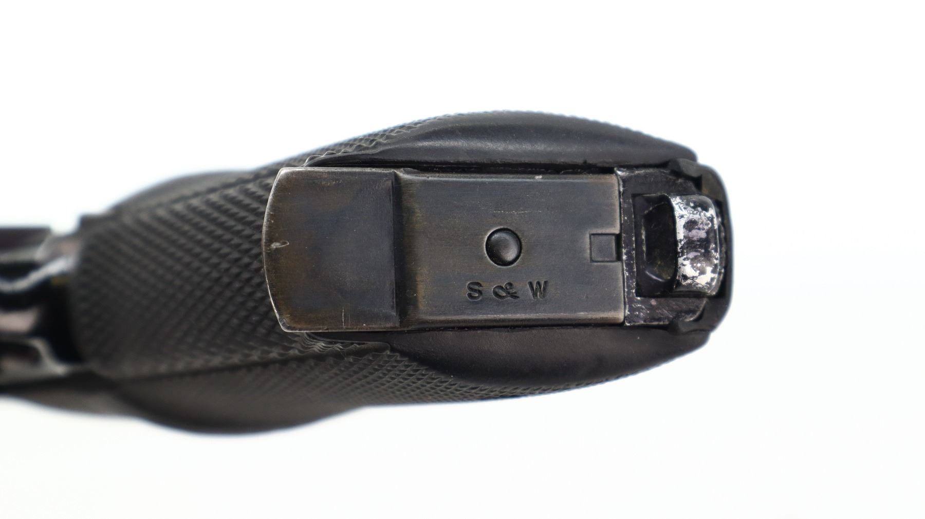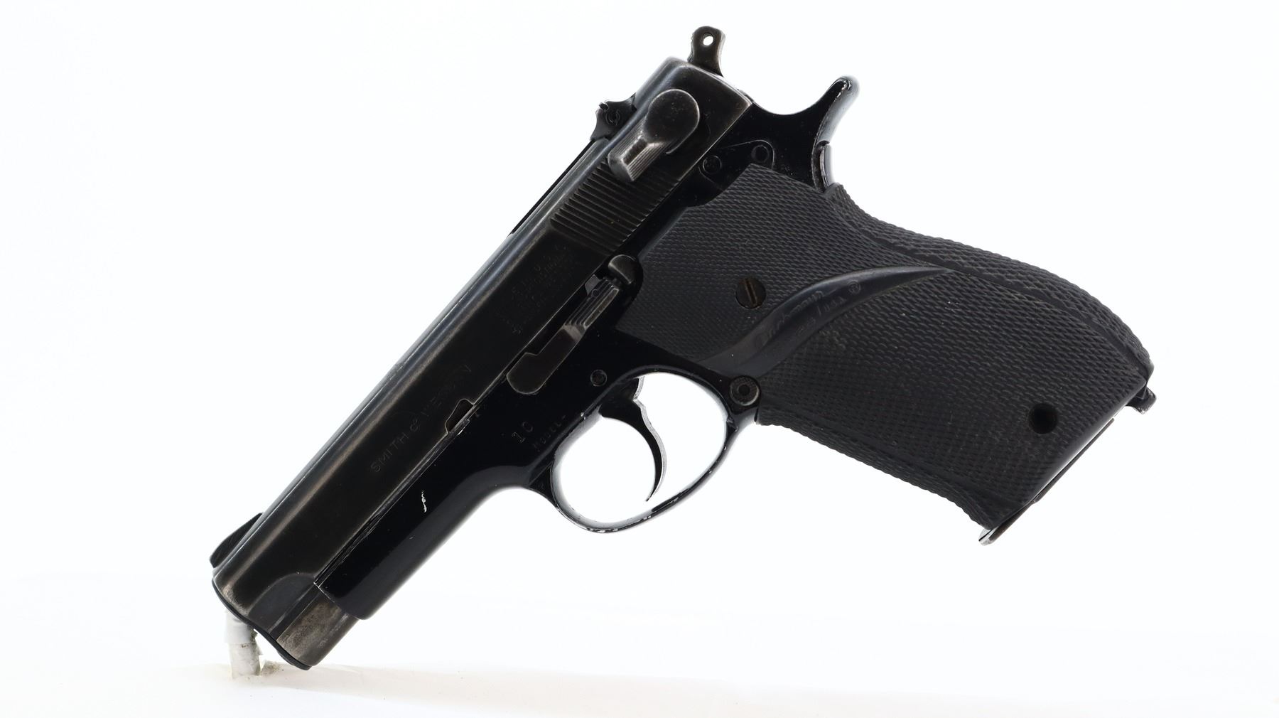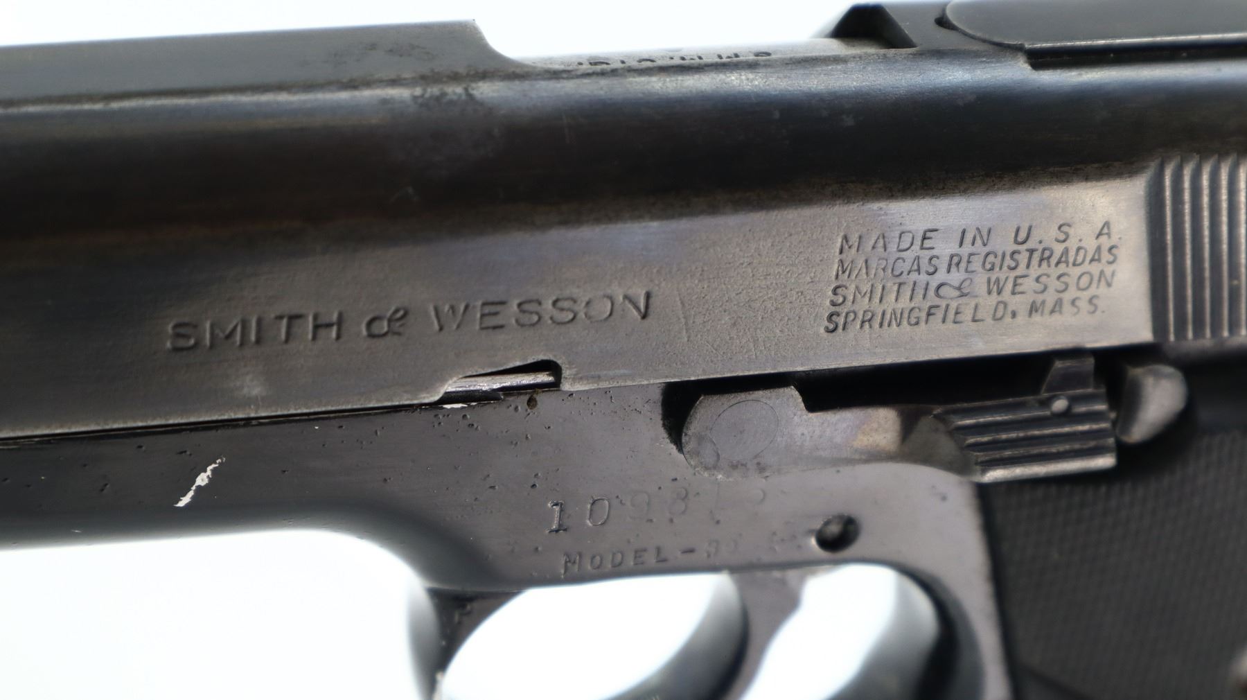 5/10 , SMITH & WESSON , MODEL: 39 , CALIBER: 9MM LUGER. COMES WITH MAGAZINE. BORE IS GOOD WITH LIGHT PITTING. BLADE FRONT SIGHT, NOTCHED REAR SIGHT. PACHMAYR WRAP AROUND GRIPS. METAL FINISH SHOWS SOME SCRATCHES, HANDLING MARKS AND WEAR. RECEIVER APPEARS TO HAVE BEEN PAINTED BLACK WITH SOME SURFACE PITTING. GRIPS MISSING ONE SCREW.. ACTION: SEMI AUTOMATIC. BARREL LENGTH: 102MM. SERIAL # 109816. CONDITION: 5/10. CLASS: CANADIAN PROHIBITED CLASS 12-6