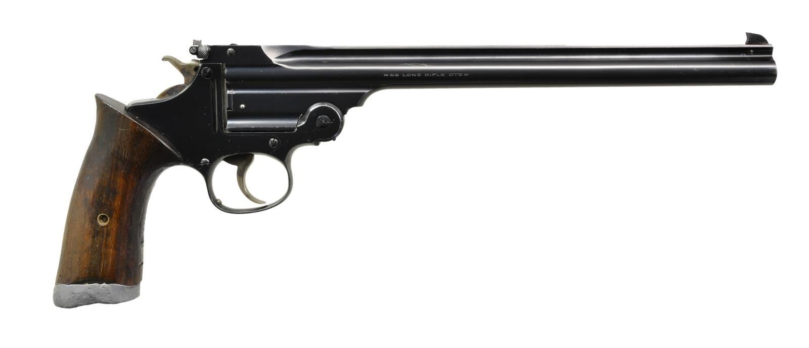 SINGLE SHOT PISTOL. Cal. 22 LR. S# 8454. Bbl. 10" w/ rib having pinned Patridge front sight & adj. square notch rear sight. Blue finish. Shooter made 2 piece walnut thumbrest grip screw attached non ferrous metal butt extension. CONDITION: over 90% blue showing scattered scratches & marks. Grips have roughly finished dark appearance. Sound mechanics. Bright bore w/ strong sharp rifling. (20-1485/DS). CURIO. $600-900.