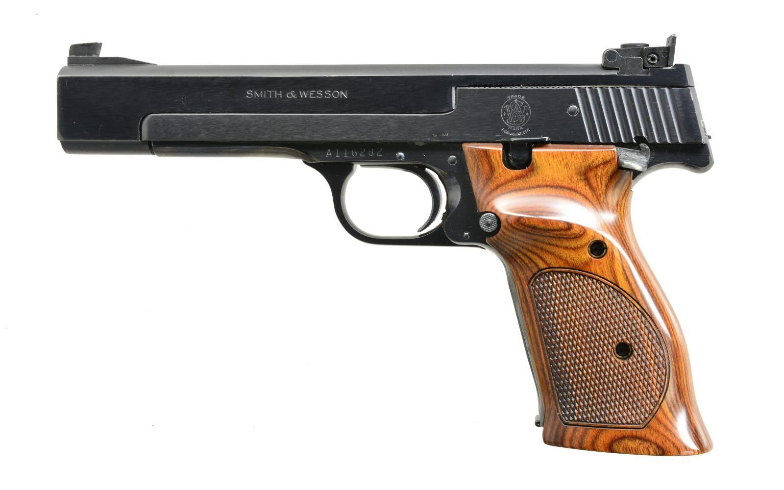 Cal. 22 LR. S# A116282. Bbl. 5 1/2". Serrated Patridge front sight w/ square notch adj. rear sight. Blue finish. 2 Piece checkered laminate thumb rest grips. MAGS: 1 detachable 10 rd. CONDITION: 98% blue showing finish loss around mag. well. Very good grips. Bright near excellent bore. (20-3258/DS). MODERN. $700-1,100.