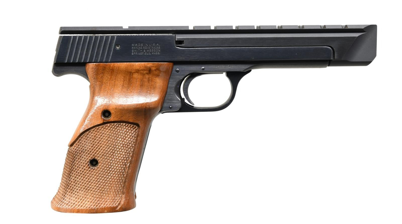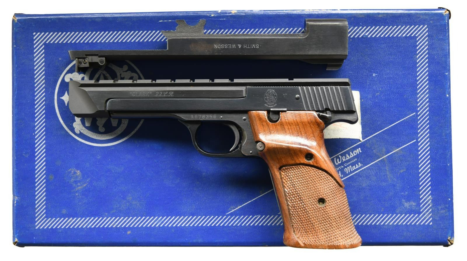 Cal. 22 LR. S# A678356. Bbl. 5 1/2" Clark match replacement. Clark bbl. has Picatinny style rail w/o sights. Thumb rest walnut grips. MAGS: none present. UNATTACHED ACCESSORIES: original S&W 5 1/2" bbl. w/ adjustable rear sight & blade front sight in very good plus condition. Also included are a blue factory box matching numbered to the gun & paperwork. CONDITION: grips show some handling wear. Metal retains 93% original blue w/ some fading on the edges & scattered light oxidation. Very good bore. (23-2122/MJC). MODERN. $1000-1500.