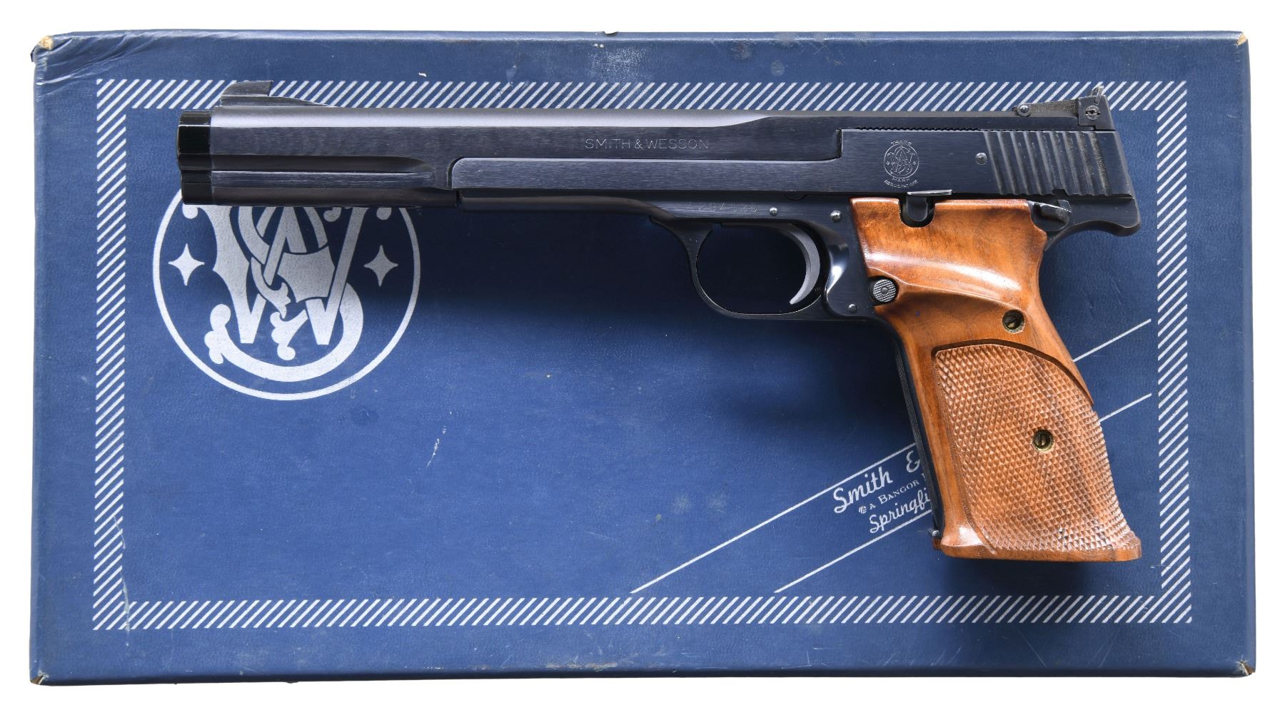 Cal. 22 LR. S# A294035. Bbl. 7 3/8". Patridge front sight. Adjustable square notch rear sight. 1976 made S&W 41 pistol. Blued finish. Checkered walnut grips with thumbrests . MAGS: 3-10 rd. UNATTACHED ACCESSORIES: matching numbered factory box with screwdriver, cleaning kit & muzzle brake. CONDITION: grips show some light handling marks. Metal retains 95% original blue with some fading on front strap, a few small spots of light oxidation most notably on beavertail & some light handling wear. Action functions properly when hand cycled. Bright near excellent bore. 0PROVENANCE: From the Lifelong Collection of George Staden S&W Member #3451. (25-140/MJC). MODERN. $800-1200.
