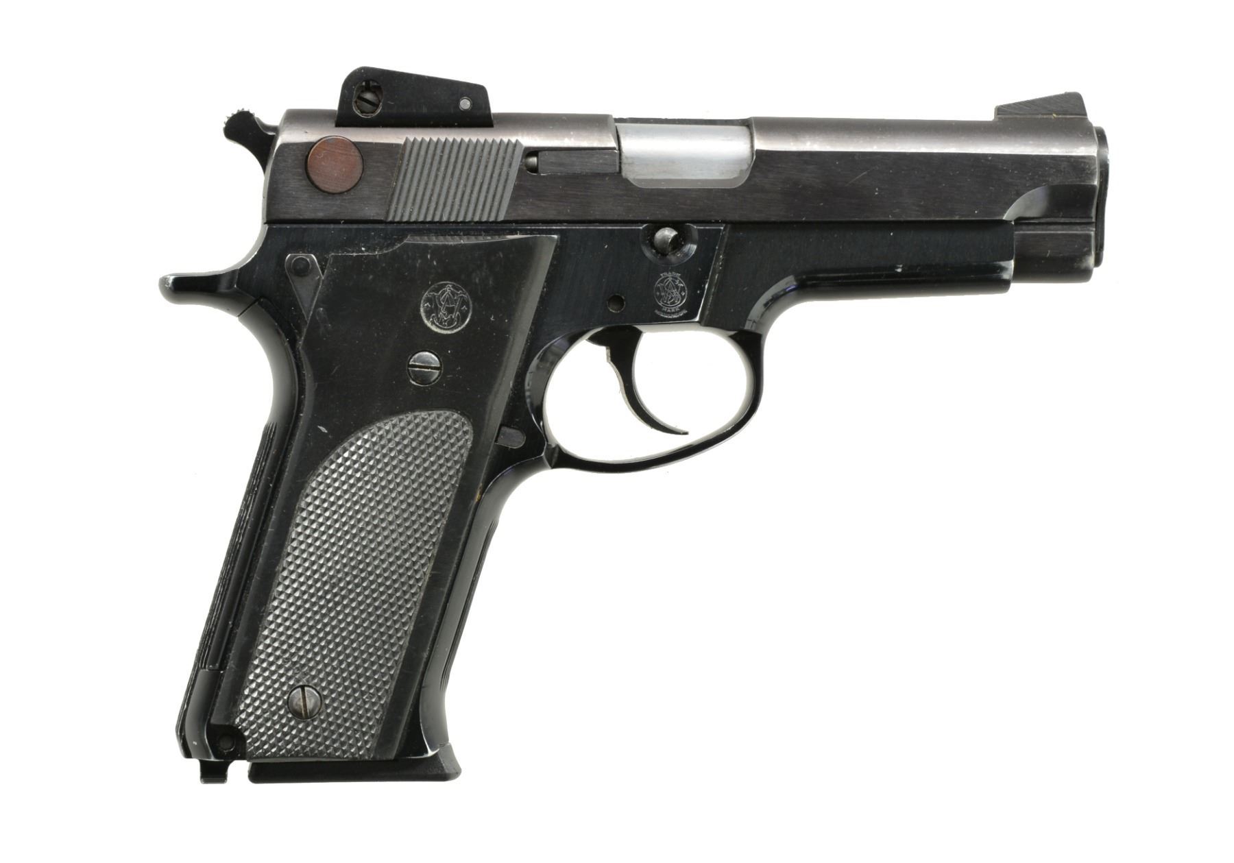 Cal. 9mm Luger. S# A734651. Bbl. 4". Mfg. 1981 (1979-1987) w/ blued finish, alloy frame, adj. rear sight, lanyard loop at butt, recoil spring guide rod & checkered plastic grips. Slide & mag. safeties. MAGS: 2 very good 14 rd. w/ push button plastic bases; 1 stainless factory & 1 blued Pro Mag. CONDITION: good plus overall appearance w/ high point wear on frame & finish loss on much of slide. Very good grips & near excellent bore. (20-753/NW). MODERN. $300-450.
