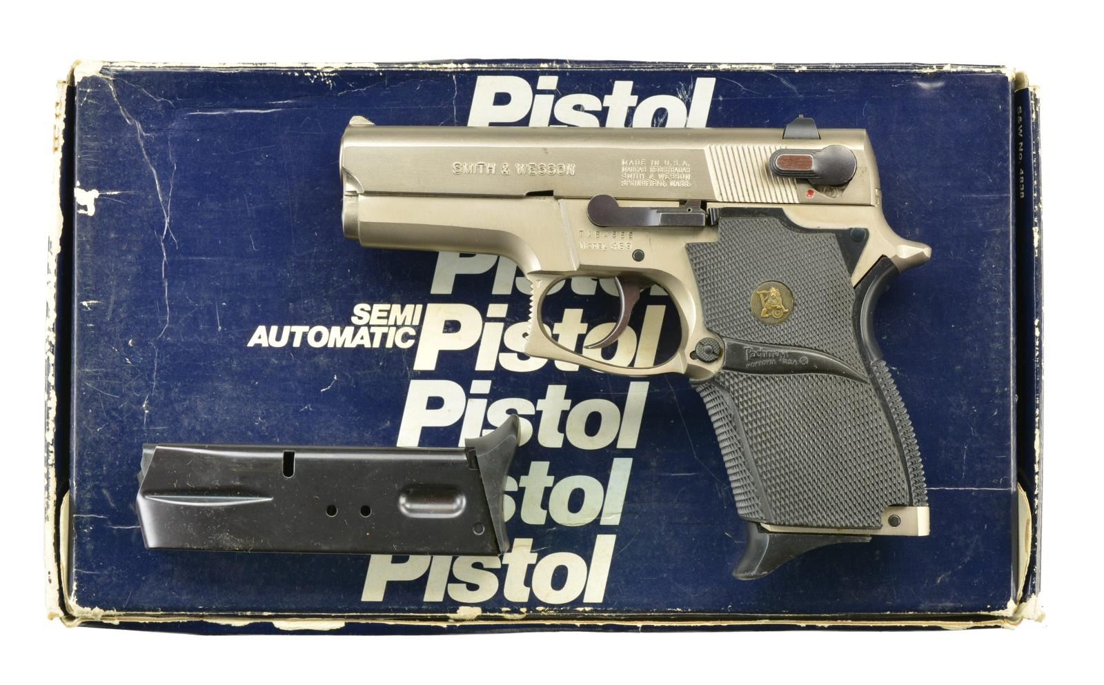 Cal. 9mm PARABELLUM. S# TAB4859. Bbl. 3.5". Mfg. 1984-1988. Traditional double action short alloy frame w/ steel slide. Bobbed hammer w/ serrated spur. Serrated slide. Serrated ramp front sight w/ yellow insert. White outline drift adjustable rear sight. Squared trigger guard w/ checkered front. Left side safety / decocker. Left side mag release. Black rubber Pachmar wrap around grips. MAGS: 2 factory 12rd. w/ finger extension. UNATTACHED ACCESSORIES: Blue factory box & paperwork. CONDITION: Original bead blasted finish illustrates a few shiny spots but still retains the majority of its original look. Shiny bore w/ strong rifling. (22-4231/JZ). MODERN. $300-500