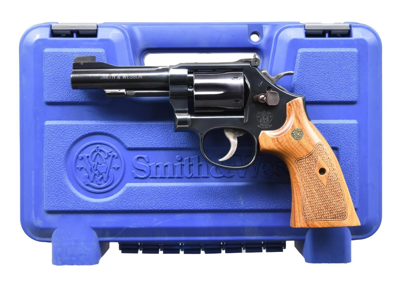 WITH MATCHING FACTORY CASE. Cal. 22 Mag. S# CTJ3625. Bbl. 4". Model 48-7 double action revolver mfg. by Smith & Wesson. The left side of the bbl. is marked "SMITH & WESSON", with the cal. designation marked across the right. Left side of frame exhibits the S&W trademark logo, with S&W's mfg. information on the right. Metal components exhibit a blued finish, with the frame being mounted with 2-piece S&W gold medallion checkered wood grips. Ramped patridge front sight with adjustable square notch rear sight. UNATTACHED ACCESSORIES: matching factory case. CONDITION: metal components retain bountiful amounts of their original factory blue finish, exhibiting few light superficial handling marks, as well as a very light dragline on the cyl. Mirror bore, exhibiting well defined rifling throughout. Grips are excellent overall. PROVENANCE: The Collection of Gun Sport Ltd owned by Jon R. Thomas. (23-4457/MLW). MODERN. $600-900.