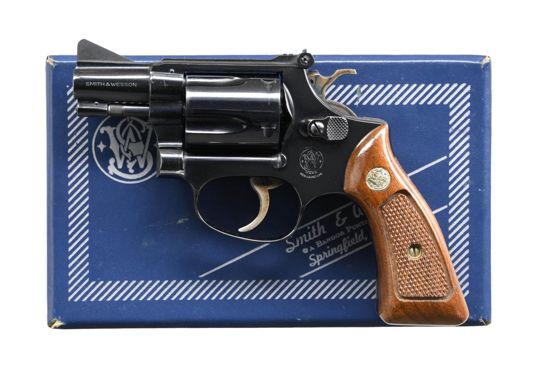 Cal. 38 Spl. S# 933J69. Bbl. 2", pinned. Ramped, serrated blade front sight. Adjustable square notch rear sight. J-frame revolver, mfg. 1955-1975. Five-shot cyl. Blued finish with case-colored trigger and hammer. Checkered walnut grips with silver S&W medallions and matching stamped number on right panel. UNATTACHED ACCESSORIES: matching-numbered factory box. CONDITION: grips show a couple light handling marks. Hammer and trigger retain nearly all their vibrant case colors with some light operational wear. Balance of metal retains 98% original blue with a light drag line on cyl. and a couple light handling marks. Action functions properly when hand-cycled. Bright, very good+ bore. (24-2585/MJC). MODERN. $1,200-1,800.