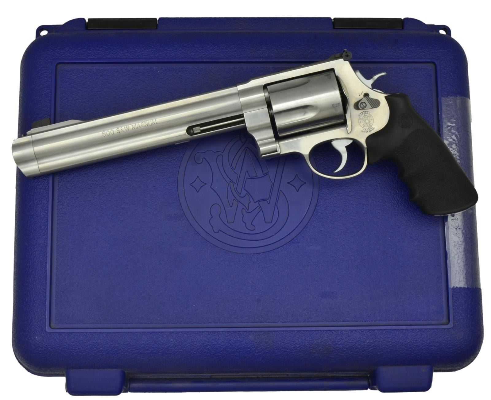 Cal. 500 S&W Magnum. S# CHV2221. Bbl. 9" ported w/ rib & full length ejector shroud. Ramp mounted Patridge front sight w/ white outline square notch adj. rear sight. Five shot fluted cyl. X frame 3 screw action. Stainless steel construction. .430" Hammer & .400 smooth combat trigger. Finger groove rubber grips w/ S&W monograms. WEIGHT: 4 lbs, 7.6 oz. Introduced in 2003. UNATTACHED ACCESSORIES: matching numbered blue plastic case. CONDITION: near excellent showing a faint cyl. drag line. Bright near excellent bore. PROVENANCE: from The Collection of Gun Sport Ltd owned by Jon R. Thomas. (23-4354/DS). MODERN. $1,000-1,500.