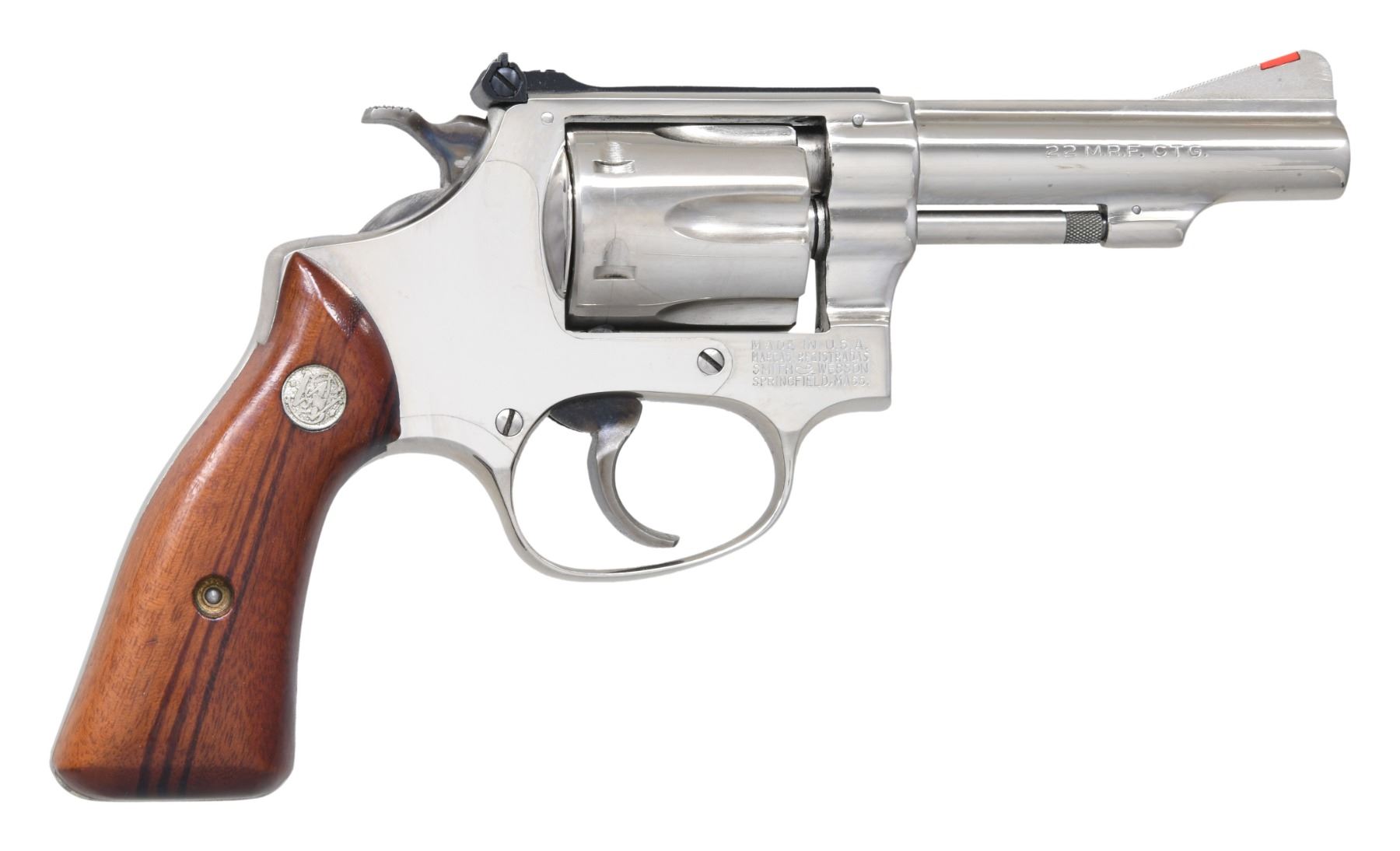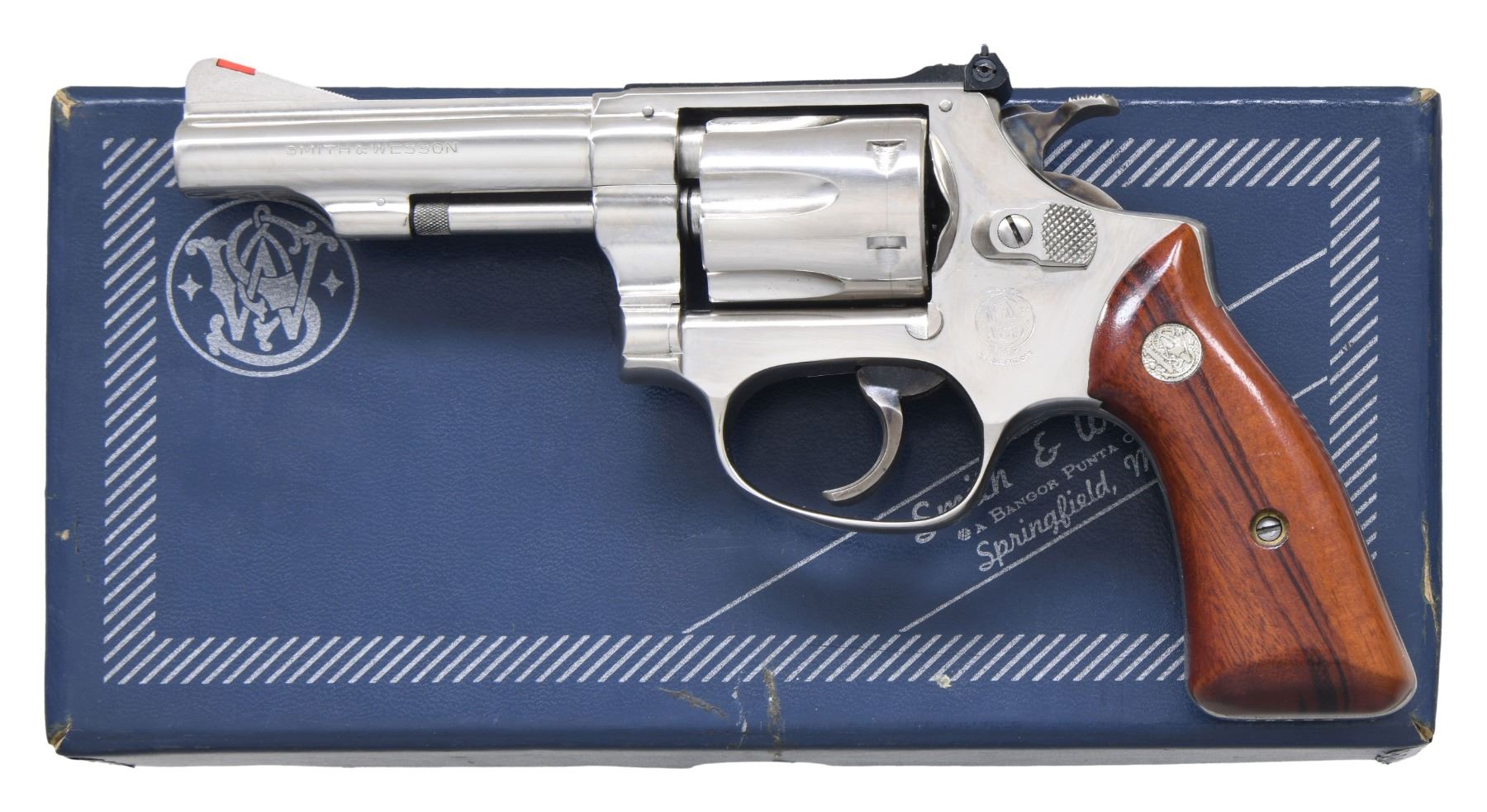 Cal. 22 Mag. S# M44153. Bbl. 3" pinned. Ramped serrated blade front sight with orange insert. Adjustable square notch rear sight with white outline. Made 1971-1973. Nickel finish with case colored trigger & hammer. Smooth hardwood grips with silver S&W medallions. UNATTACHED ACCESSORIES: unnumbered but correct factory box with manual. CONDITION: grips show light handling wear. Trigger & hammer retain nearly all their case colors with some light operational wear. Balance of metal retains nearly all its original nickel with some light handling & operational wear. Action functions properly when hand cycled. Bright near excellent bore. PROVENANCE: From the Lifelong Collection of George Staden S&W Member #3451. (25-153/MJC). CURIO. $1000-1500.