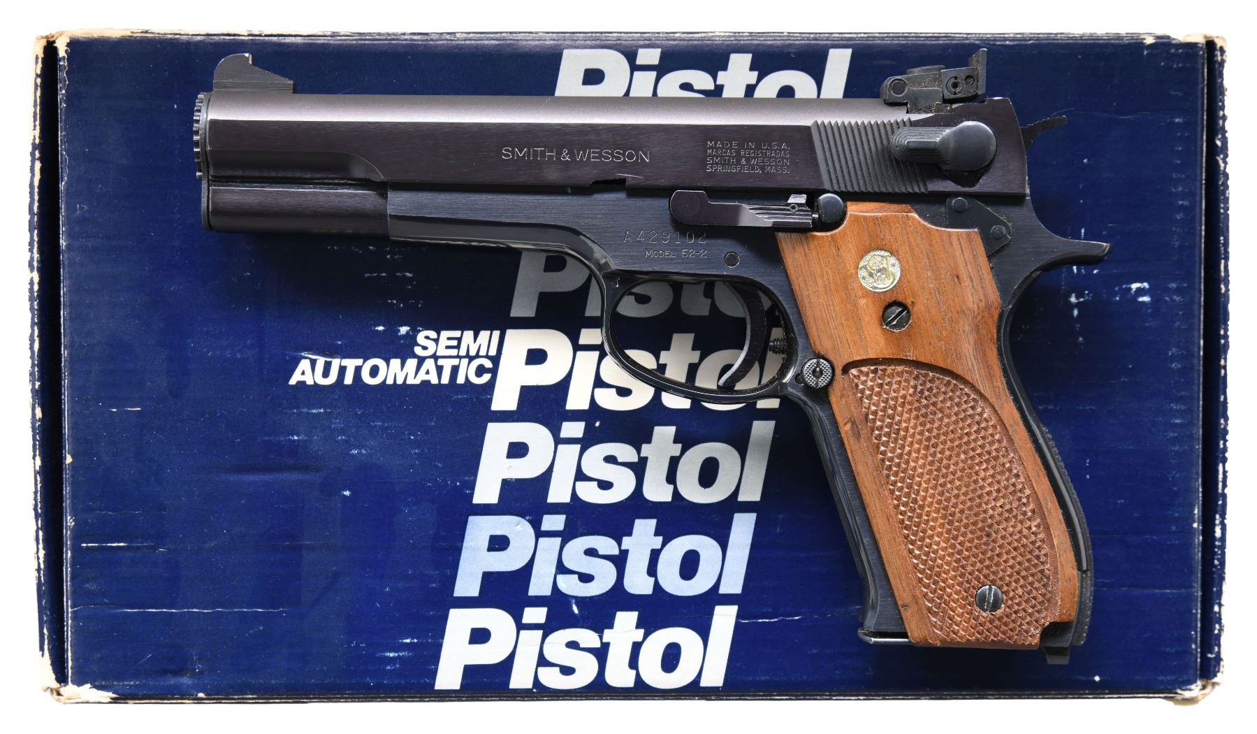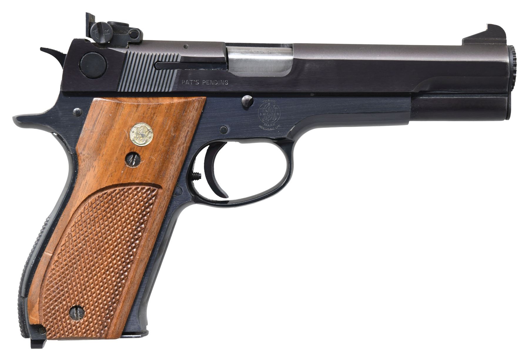 Cal. 38 Spcl Mid Range. S# A429102. Bbl. 5". Patridge front sight with added white paint. Adjustable square notch rear sight. Target semi-auto pistol chambered in 38 Special wadcutter. Mfg. 1977-1978 Blued finish. Checkered hardwood grips with silver S&W medallions. MAGS: 2-4 rd. UNATTACHED ACCESSORIES: matching numbered factory box with manual & tool. CONDITION: grips show scattered light scratches & handling marks. Metal retains 98% original blue with some light edge wear & a couple light scratches. Action functions properly when hand cycled. Bright near excellent bore. (24-6630/MJC). MODERN. $700-1000.