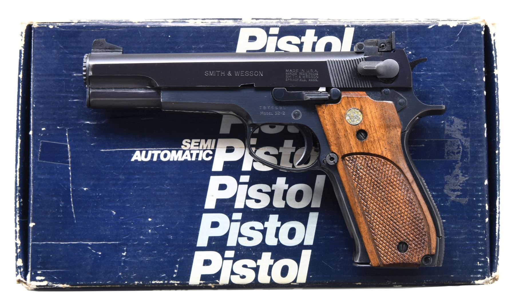 Cal. 38 Spl. Wadcutter. S# TBY5595. Bbl. 5". Patridge front sight. Adjustable rear sight. Late production Model 52-2 pistol. Blued finish. Checkered walnut grips with silver S&W medallions. MAGS: 2-6 rd. UNATTACHED ACCESSORIES: matching numbered factory box with bushing tool, manual, paperwork & set of Accu-Riser grips. CONDITION: grips show a few handling marks. Metal retains 80% original blue with notable fading to brown on both grip straps, a couple areas of discoloration on right side of frame, some light oxidation on the slide & some edge wear. Action functions properly when hand cycled. Bright near excellent bore. PROVENANCE: From the Lifelong Collection of George Staden S&W Member #3451.(25-155/MJC). MODERN. $800-1200.