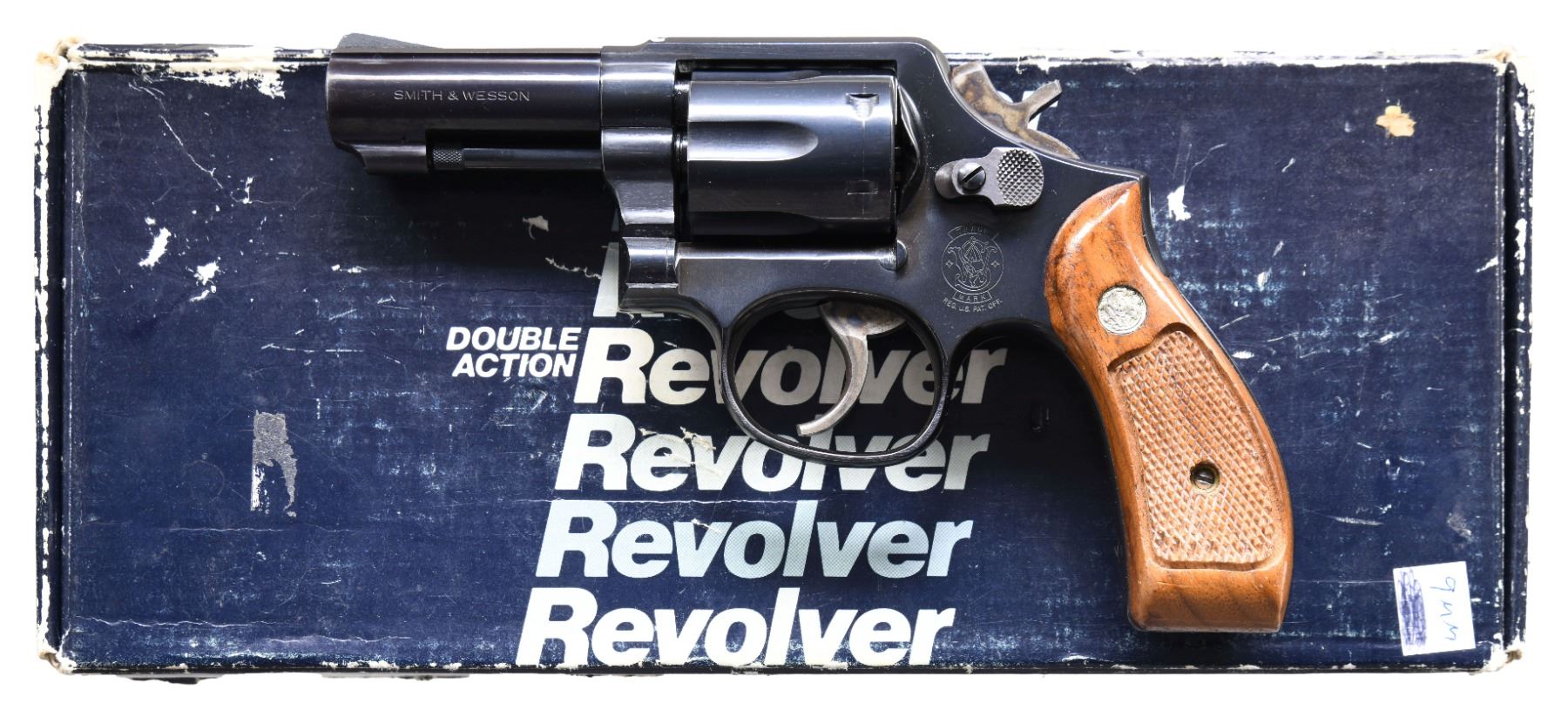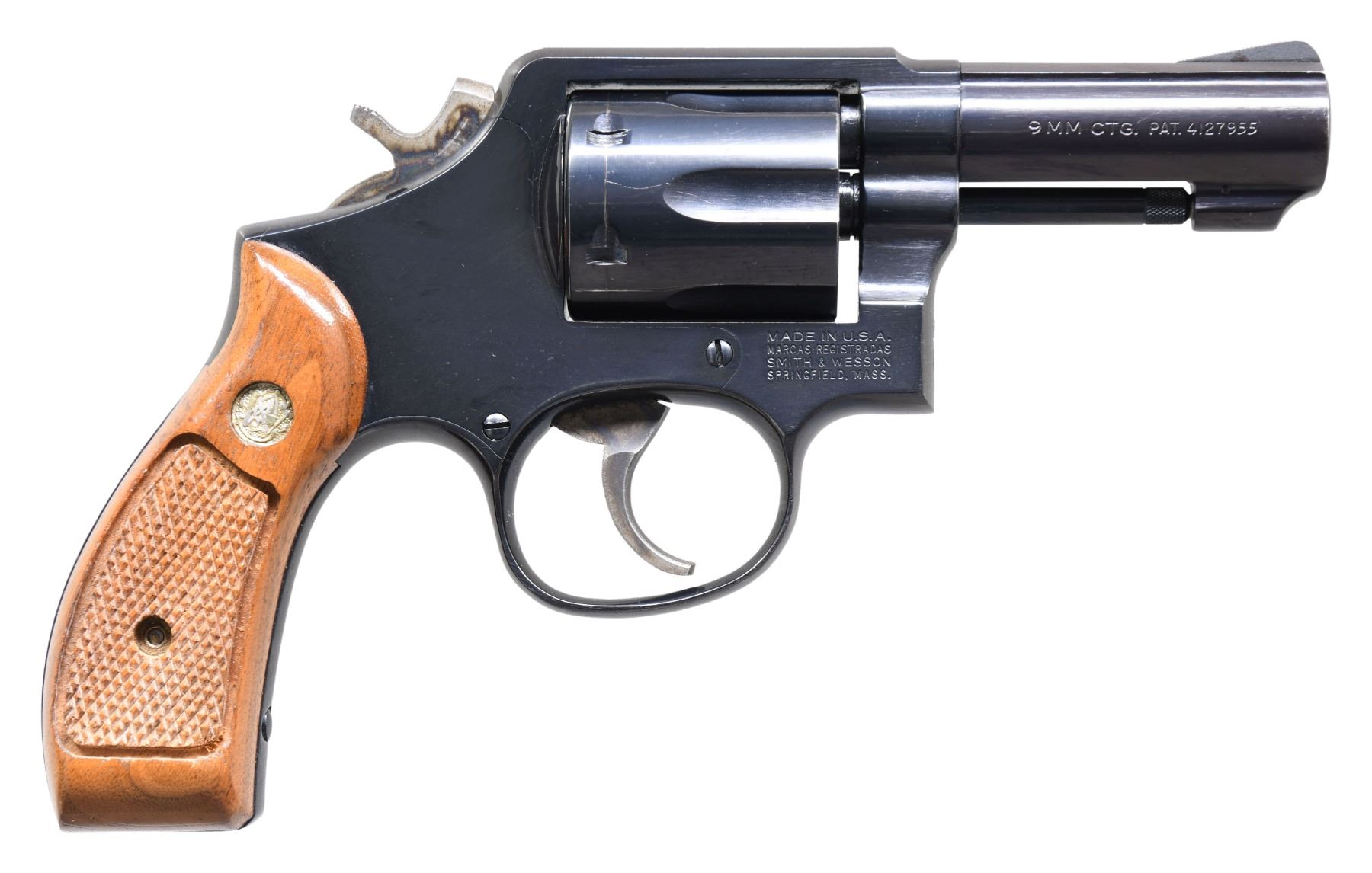 Cal. 9x19. S# ABK7623. Bbl. 3". Ramped serrated blade front sight. Fixed rear sight. Blued finish with case colored trigger & hammer. Checkered walnut grips with silver S&W medallions. UNATTACHED ACCESSORIES: matching numbered factory box in fair condition with manual & paperwork. CONDITION: grips show scattered light handling marks. Trigger & hammer retain most of their case colors with some operational wear & light oxidation. Balance of metal retains 92% original blue with some light edge wear & light oxidation with fading on backstrap. Action functions properly when hand cycled. Near excellent bright bore. PROVENANCE: From the Lifelong Collection of George Staden S&W Member #3451. (25-158/MJC). MODERN. $1000-1500.