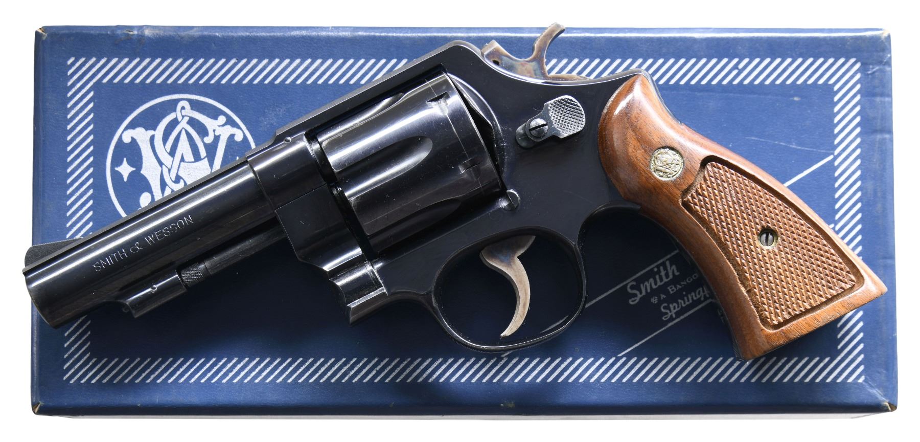 Cal. 41 Mag. S# S296446. Bbl. 4" heavy & pinned. Ramped serrated blade front sight. Fixed rear sight. S&W Model 58 made 1967-1968. Blued finish with case colored trigger & hammer. Checkered walnut grips with silver S&W medallions. UNATTACHED ACCESSORIES: unnumbered but correct factory box. CONDITION: grips show a couple dings & a few scattered handling marks. Hammer & trigger retain most of their case colors with some operational wear. Balance of metal retains 92% original blue with scattered edge wear & fading. Action functions properly when hand cycled. Near excellent bore. PROVENANCE: From the Lifelong Collection of George Staden S&W Member #3451. (25-164/MJC). CURIO. $800-1200.