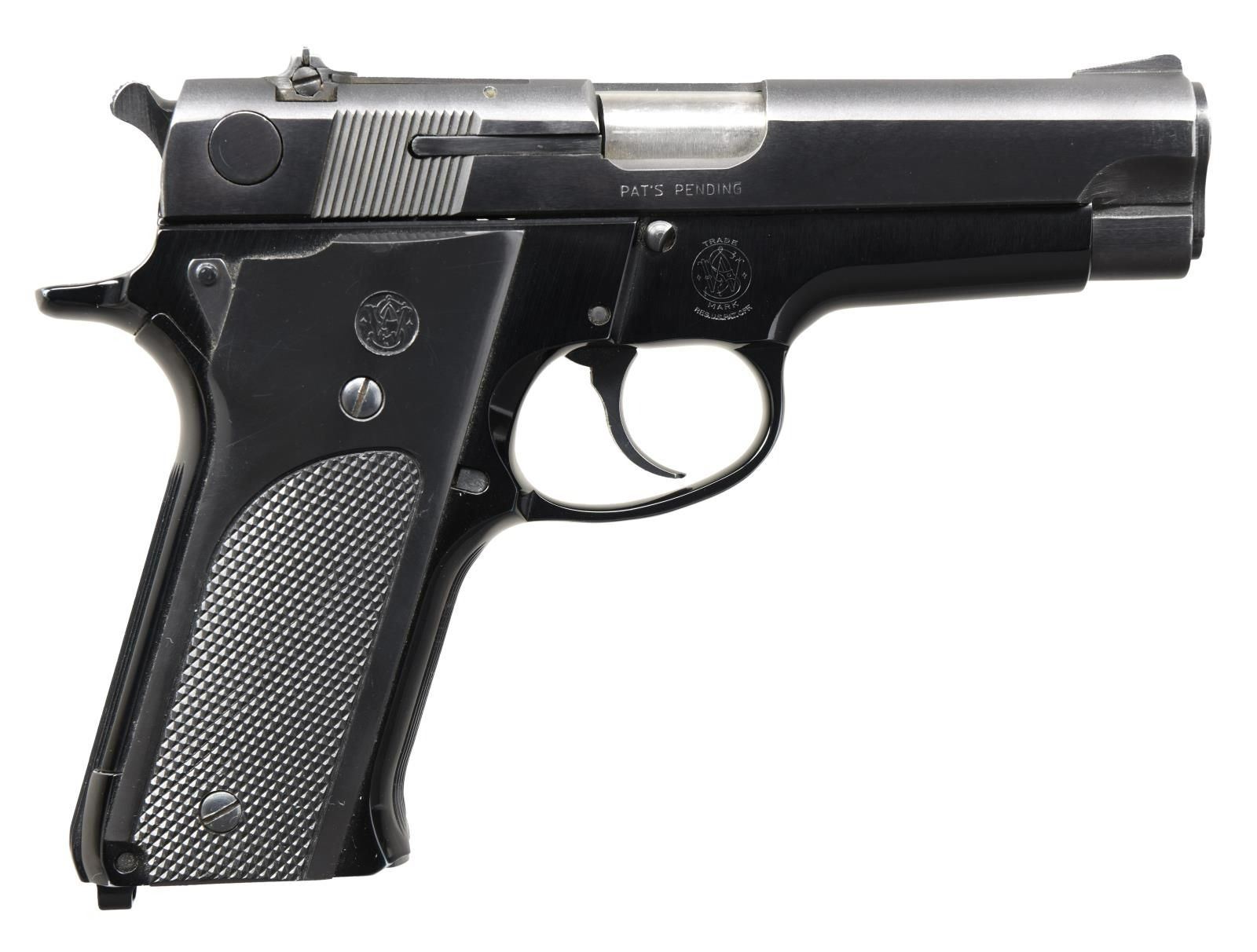 Cal. 9mm Luger. S# A393592. Bbl. 4". Serrated ramp blade front sight. Square notch rear sight. Blue finish slide. Anodized frame. Black checkered grips w/ S&W logo. MAGS: 1-14 rd. UNATTACHED ACCESSORIES: matching numbered factory box w/ factory parts list, bore brush & cleaning rod. CONDITION: grips show scattered light scratches & handling marks. Metal retains 93% finish w/ some light scratches & handling wear. Very good plus bright bore. (23-4973/MJC). MODERN. $300-500.