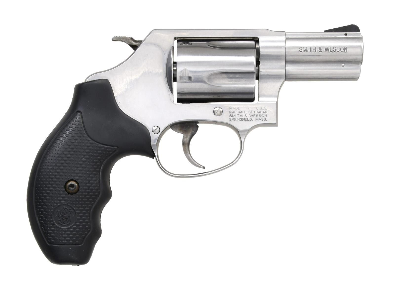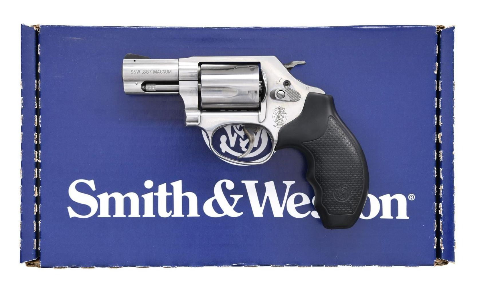 WITH MATCHING FACTORY BOX. Cal. 357 Mag. S# DDP2148. Bbl. 2 1/8". Model 60-14 double action revolver mfg. by Smith & Wesson. The left side of the bbl. is marked with the cal. designation, with the right being stamped "SMITH & WESSON". Left side of frame exhibits the S&W trademark logo, with S&W's mfg. information on the right. Metal components exhibit a polished stainless steel finish, with the frame being mounted with a 1-piece S&W textured black rubber grip. Blued serrated ramp front sight with frame notched rear sight. UNATTACHED ACCESSORIES: matching factory box containing factory paperwork. CONDITION: excellent, with metal components retaining bountiful amounts of their original factory finish overall. Cyl. bears a light dragline from cycling of the action. Mirror bore, exhibiting strong polygonal rifling throughout. Grip is very good overall. Box shows some mild exterior wear, but otherwise remains sturdy and serviceable. PROVENANCE: The Collection of Gun Sport Ltd owned by Jon R. Thomas. (23-4502/MLW). MODERN. $400-600.