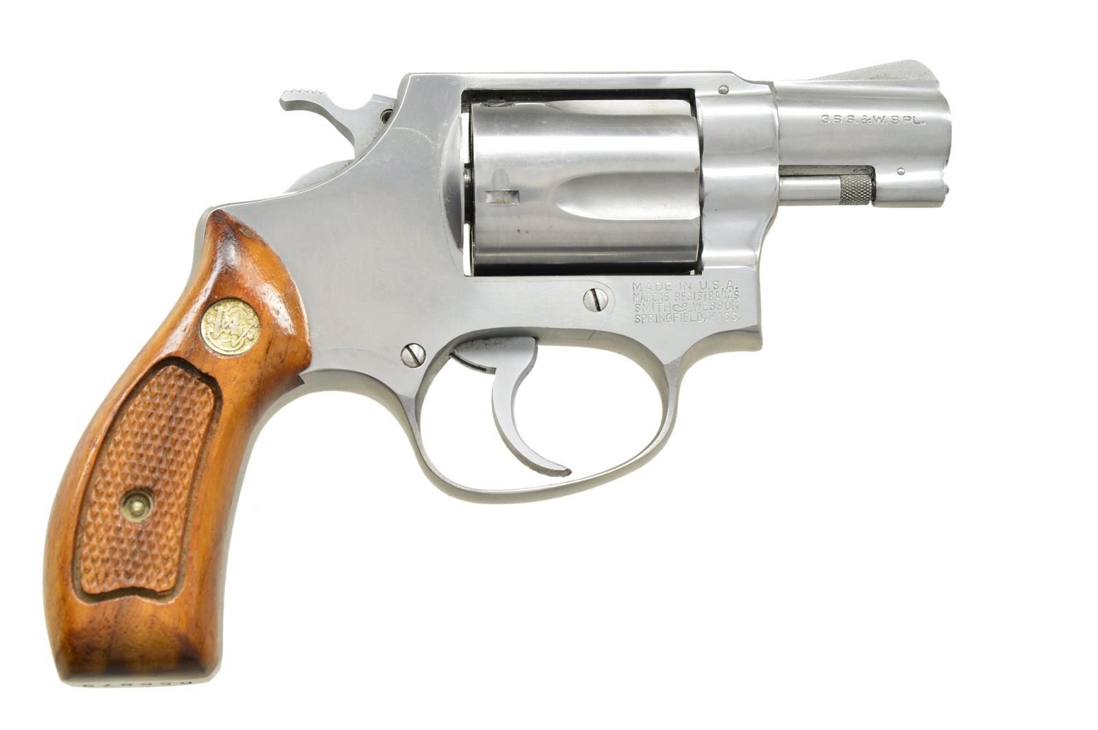 REVOLVER. Cal. 38 Spl. S# R56879 (approx. 1972). Pinned 2" bbl. Stainless finished, rnd. butt, J frame, 3 screw revolver. 5 shot fluted cyl. Service hammer & combat trigger. Matching numbered 2 piece checkered bordered Magna walnut grips w/ medallions. UNATTACHED ACCESSORIES: S&W B04 62 black leather holster in good condition. CONDITION: very good overall w/ a few handling marks & pinprick oxidation. Very good bore. (23-55/MD). CURIO. $400-600.