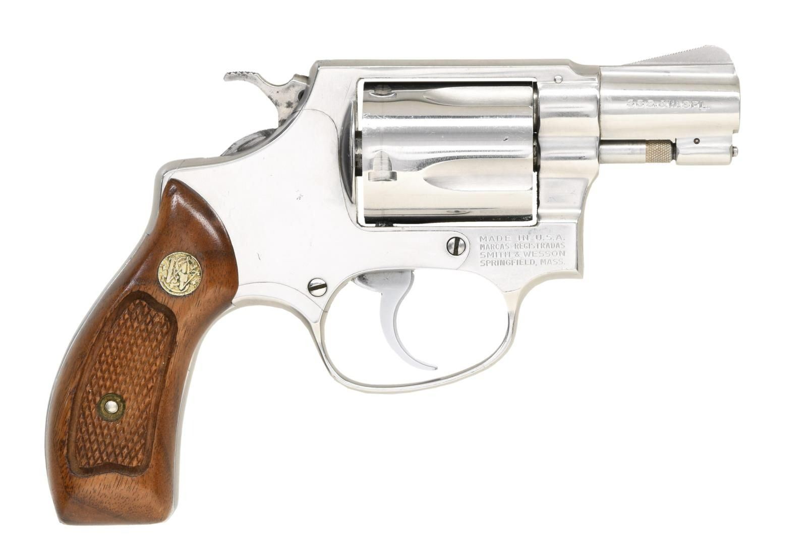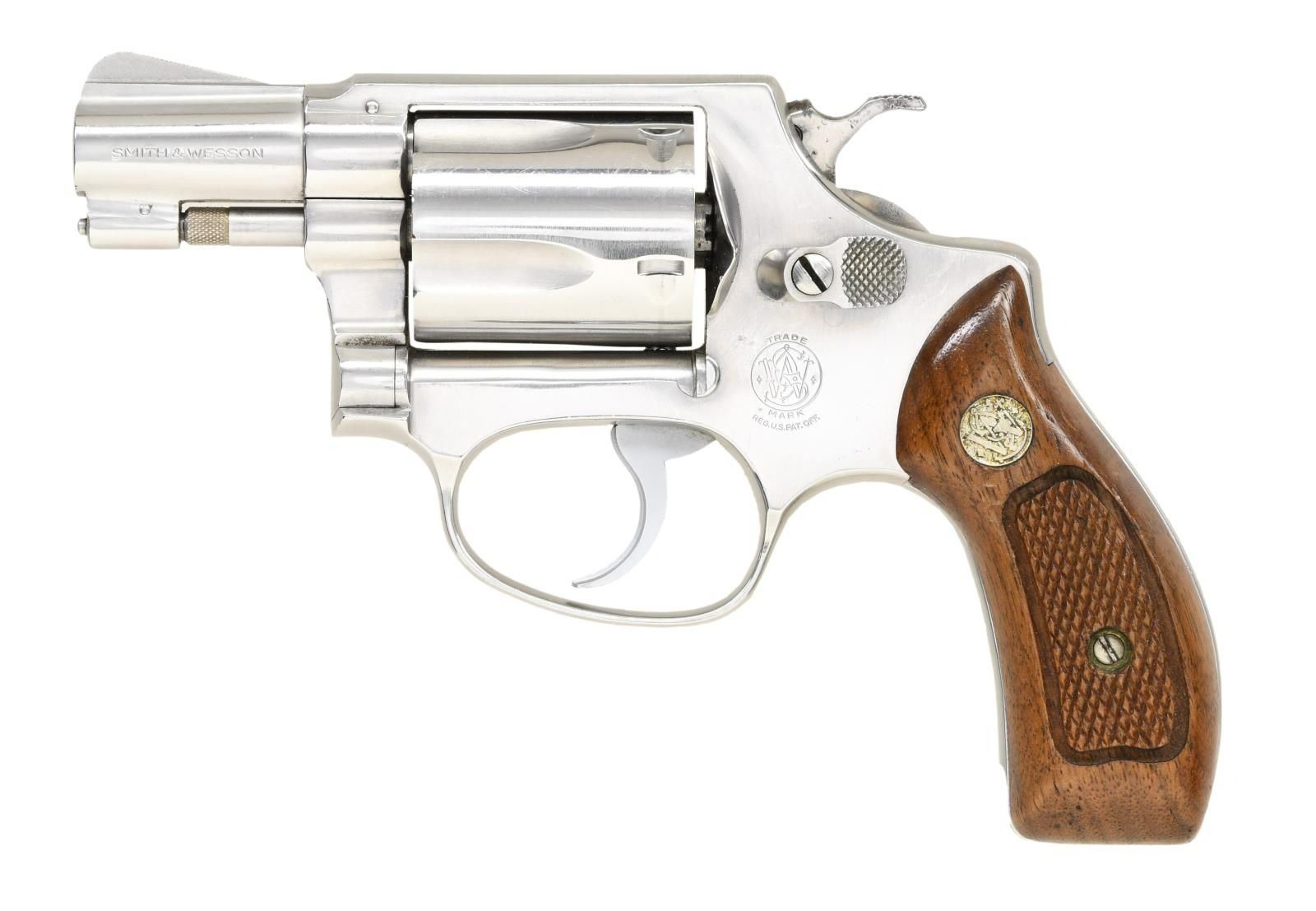 Cal. 38 Spl. S# R122445. Bbl. 2" pinned. Serrated ramped blade front sight. Fixed rear sight. Mfg. 1974-77. Stainless finish. Checkered walnut magna grips w/ silver S&W medallions. CONDITION: grips show some handling marks. Metal shows scattered light scratches & some dings. Very good bright bore. (23-5314/MJC). MODERN. $400-600.