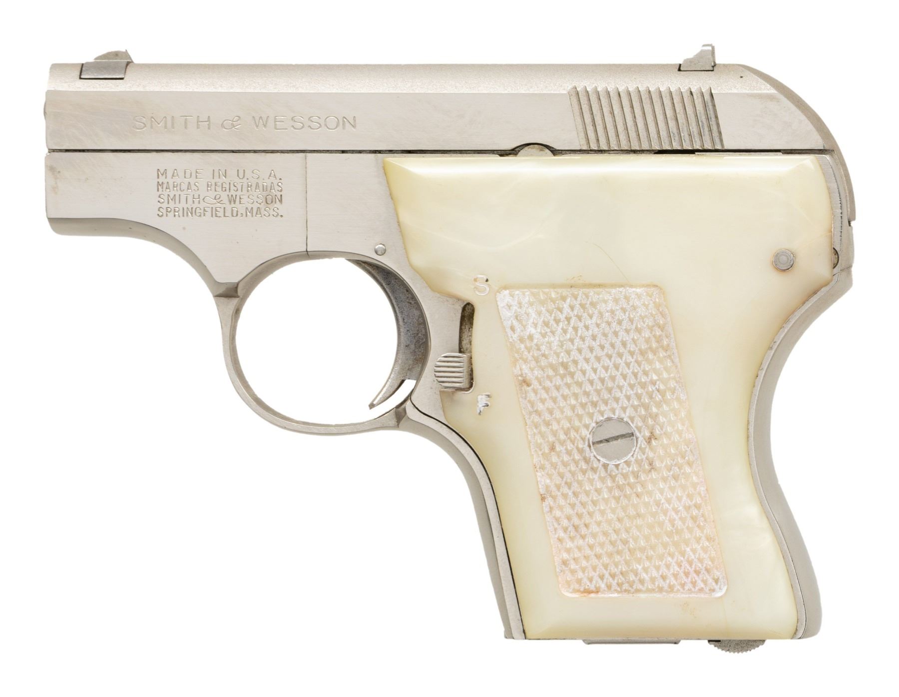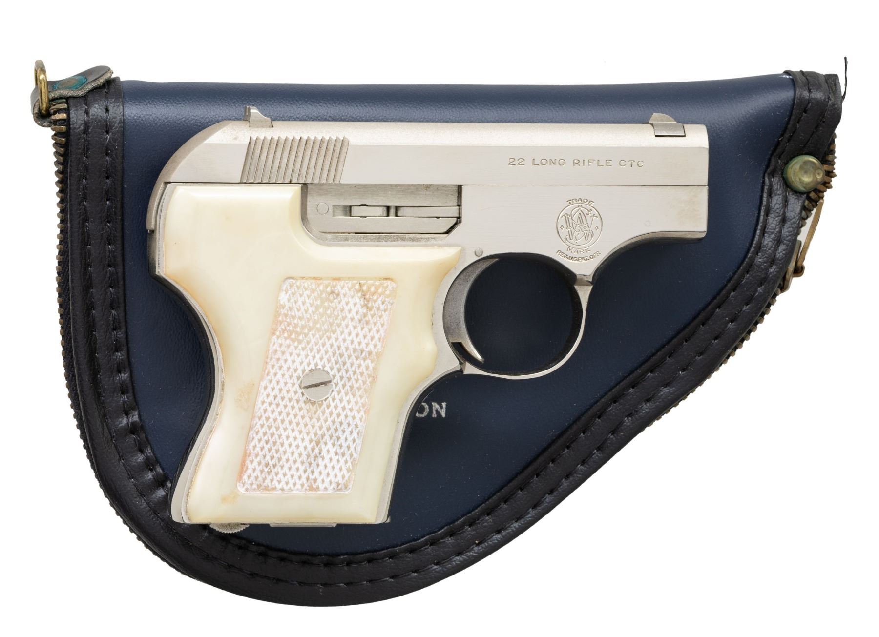 Cal. 22 LR. S# B28647. Bbl. 2 1/8". Blade front sight. Square notch rear sight. 61-2 mfr. 1970. Nickel finish. White plastic grips. MAGS: 1-5 rd. UNATTACHED ACCESSORIES: S&W softcase & upper half of a factory box for a blued Model 61. CONDITION: grips show some staining, some dings, checkering wear & a small crack on bottom of left panel. Metal shows some handling marks & some light oxidation. Action functions properly when hand cycled. Very good bore with strong rifling. (25-4359/MJC). CURIO. $150-250.