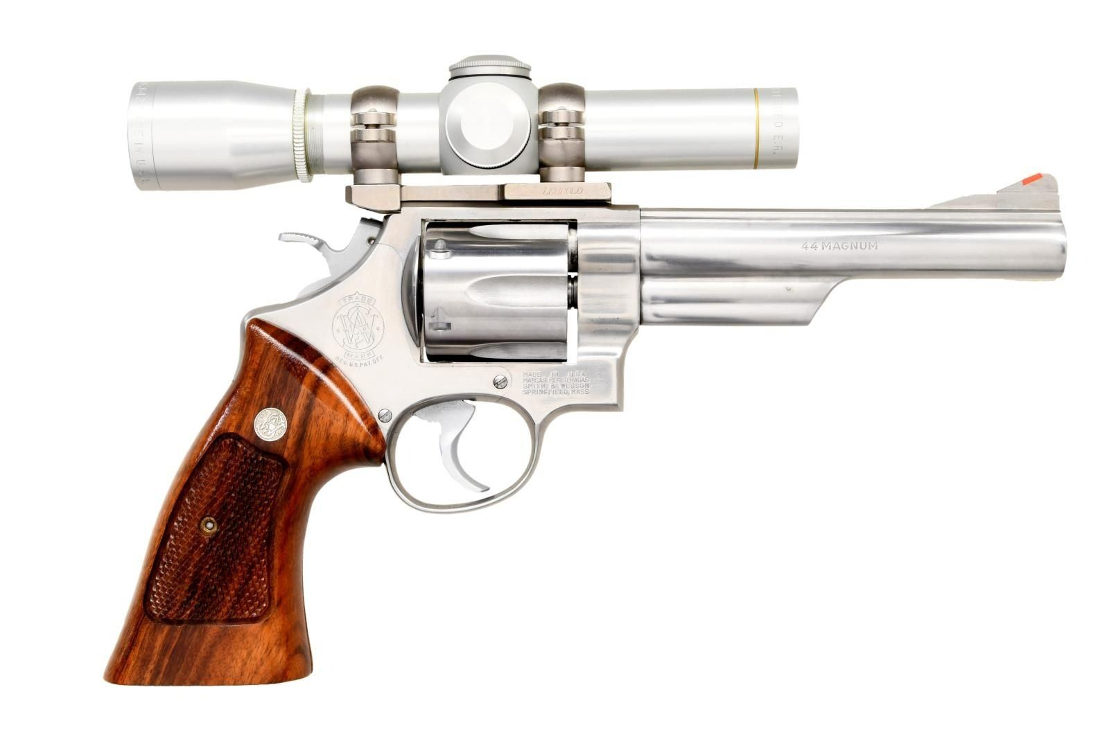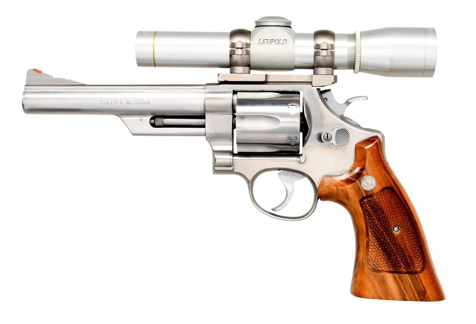 WITH SCOPE. Cal. 44 Mag. S# AUR7029. Bbl 5 7/8". Model 629-1 double action revolver manufactured by Smith & Wesson. The left side of the barrel is stamped "SMITH & WESSON", with the caliber designation across the right. Right side of frame bears the S&W trademark logo and S&W's manufacturer information. Metal components exhibit a stainless steel finish, with the frame being mounted with 2 piece S&W silver medallion checkered wood grips, as well as with a Leupold M8-2X EXTENDED E.R. scope. CONDITION: very good overall, with metal components exhibiting few superficial marks from handling and storage. Mirror bore, exhibiting well defined rifling throughout. Grips are very good overall. Scope retains a clear and sharp optic. (23-2677/MLW). MODERN. $800-1,200.