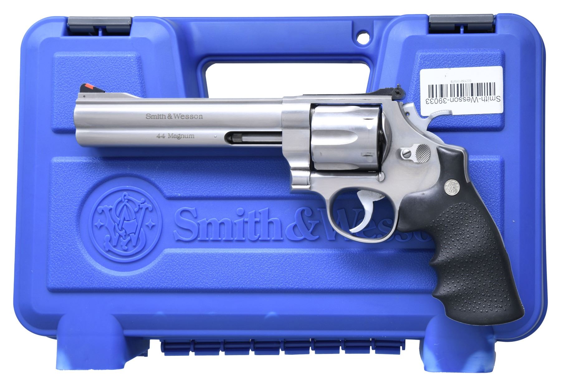 Cal. 44 Mag. S# BPK0430. Bbl. 6 1/2" with full underlug. Ramped serrated blade front sight with orange insert. Adjustable square notch rear sight with white outline. Stainless finish with hard chrome hammer & trigger. Hogue Monogrip with finger grooves & silver S&W medallions. UNATTACHED ACCESSORIES: factory hardcase that is not numbered to the revolver. CONDITION: metal & grips show scattered light handling marks & usage wear. Action functions properly when hand cycled. Bright near excellent bore. PROVENANCE: From the Lifelong Collection of George Staden S&W Member #3451. (25-172/MJC). MODERN. $800-1200.