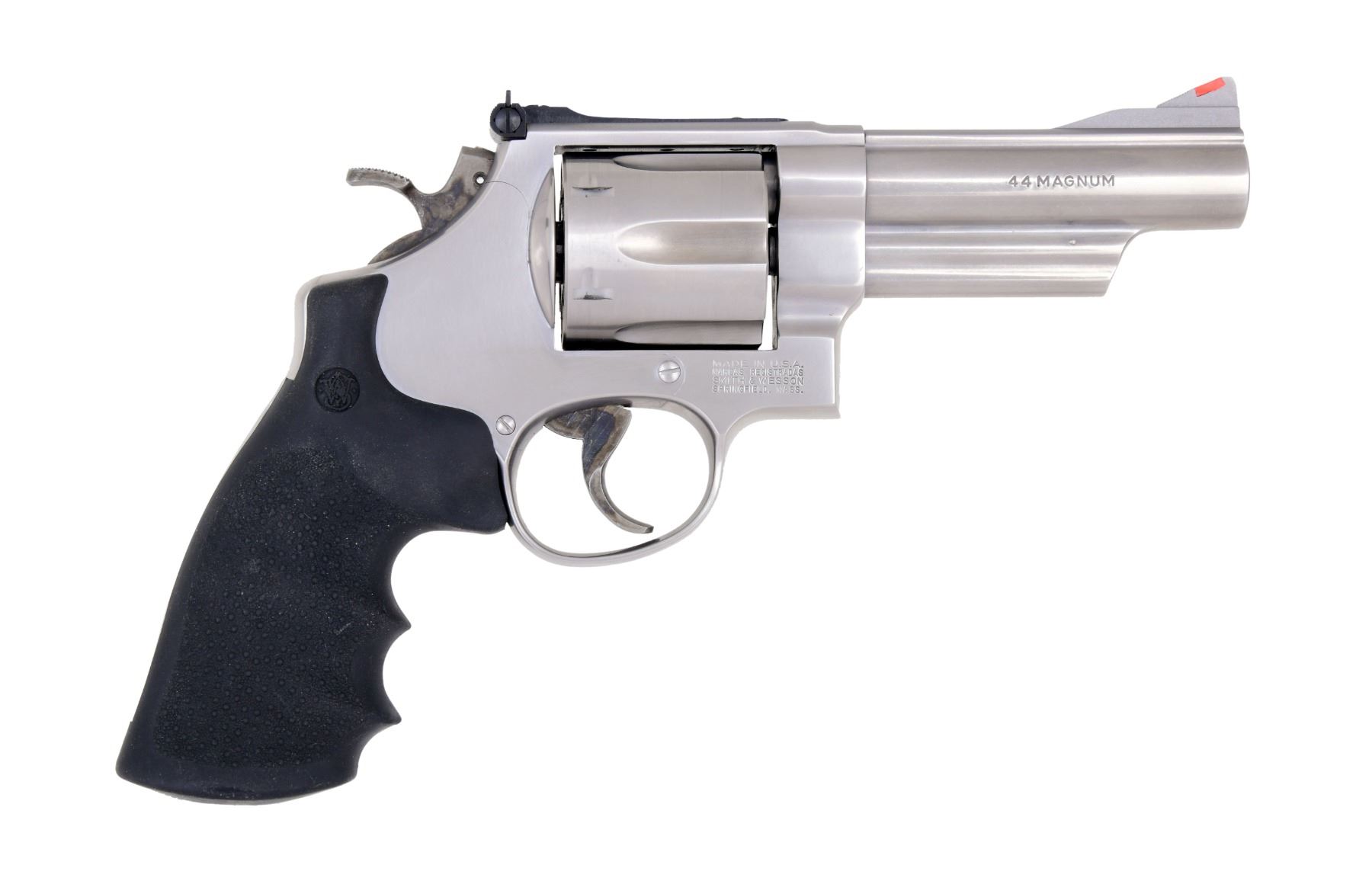 Cal. 44 Magnum. S# BRK4345. Bbl. 4" with rib & shrouded ejector. Red ramp front sight with white outline square notch adj. rear sight. Stainless steel construction. Case-colored target hammer and smooth target trigger. S&W finger groove rubber grips. UNATTACHED ACCESSORIES: 1-piece blue box with matching label. Box contains instructions, service card, warrantee paper, safety brochure, & NRA advertisement. CONDITION: near excellent, showing a faint cyl. drag line. Bright, near-excellent bore. (23-6694/DS). MODERN. $800-1,200.