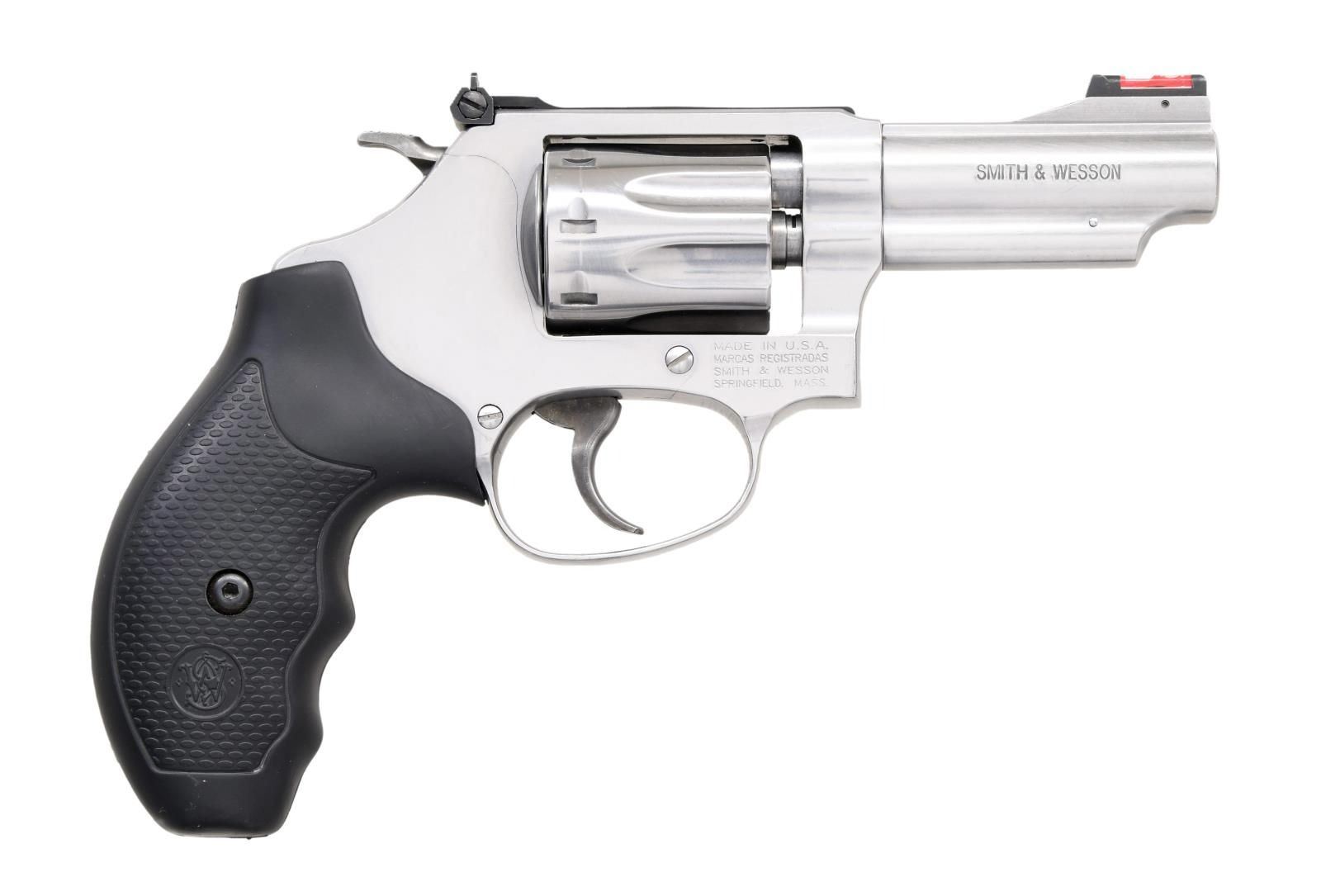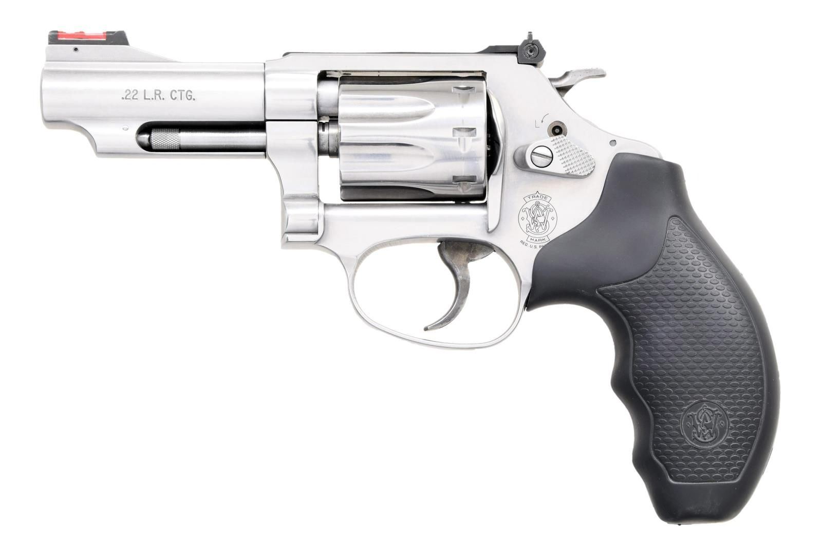 Cal. 22 LR. S# CTK5033. Bbl. 3". Model 63-5 double action revolver mfg. by Smith & Wesson. The left side of the bbl. is stamped with the cal. designation, with "SMITH & WESSON" stamped on the right. Left side of frame exhibits the S&W trademark logo, with S&W's mfg. information on the right. Metal components exhibit a stainless steel finish, with the frame being mounted with a 1-piece S&W textured black rubber grip. Ramped red fiber optic front sight with adjustable square notch rear sight. CONDITION: metal components are very good, exhibiting some scattered superficial marks from handling and storage. Mirror bore, exhibiting well defined rifling throughout. Grip is very good overall. PROVENANCE: The Collection of Gun Sport Ltd owned by Jon R. Thomas. (23-4294/MLW). MODERN. $600-900.