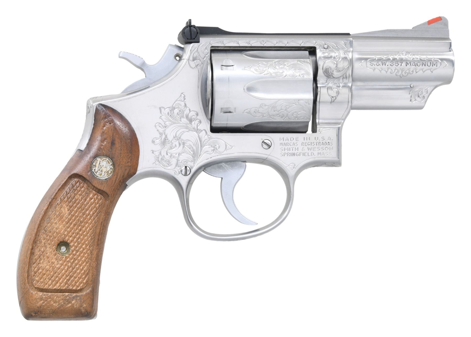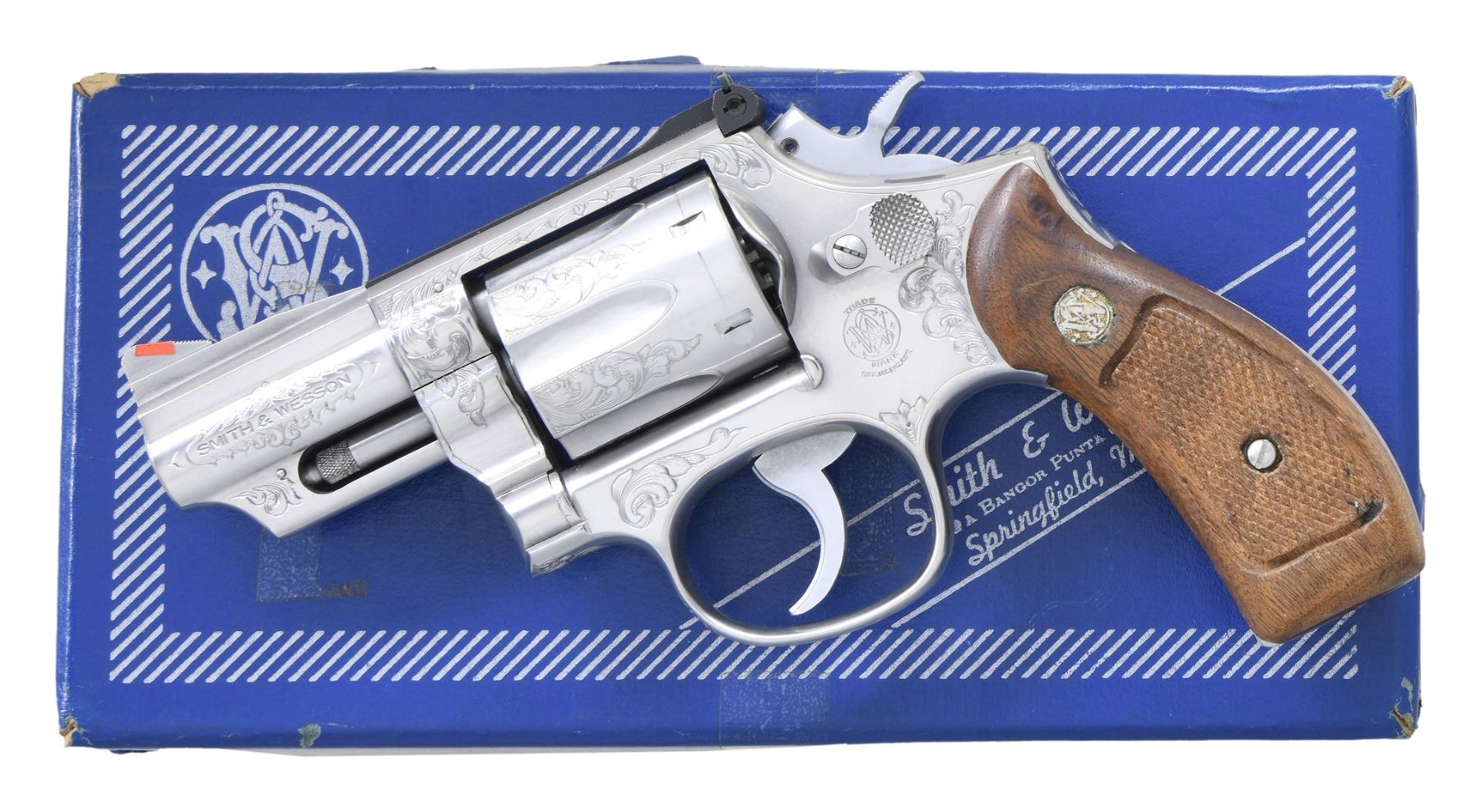 REVOLVER. Cal. 357 Magnum. S# 94K4997. Bbl. 2 1/2" pinned w/ rib & shrouded extractor. Serrated red ramp front sight & square notch rear sight. 3 screw K frame. Stainless steel construction. Frame, bbl. & cyl. have 50% coverage custom floral pattern engraving. Signature "K. Hurst" is found above model markings on inside of frame. The late Ken Hurst was a master engraver known for his work w/ Colt. .265" service trigger & .375" hammer. 2 piece checkered magna grips w/ S&W medallions. UNATTACHED ACCESSORIES: original box containing holster & ammo pamphlets w/ caution card. Box is lightly tattered w/ added tape in one tapped corner. CONDITION: very good polished stainless metal. Grips have worn & blistering finish. Very good bore. PROVENANCE: Lifelong Collection of Bill Peterken. (24-6103/DS). MODERN. $800-1,200.