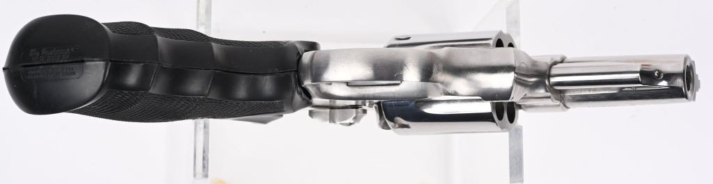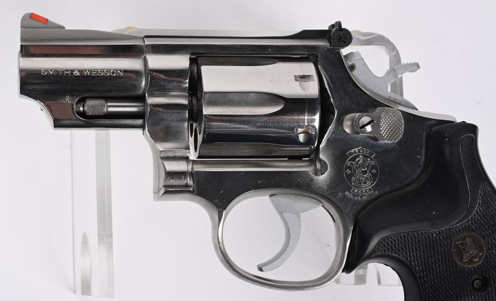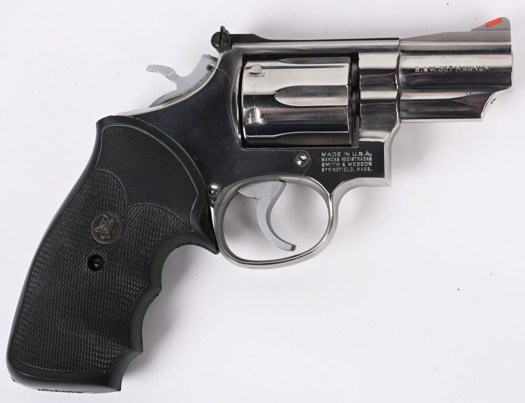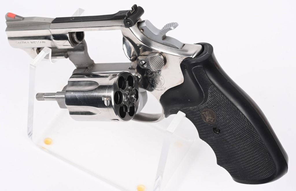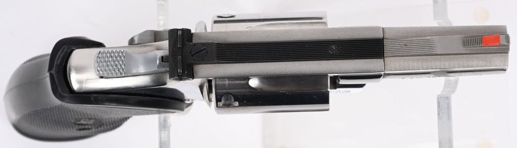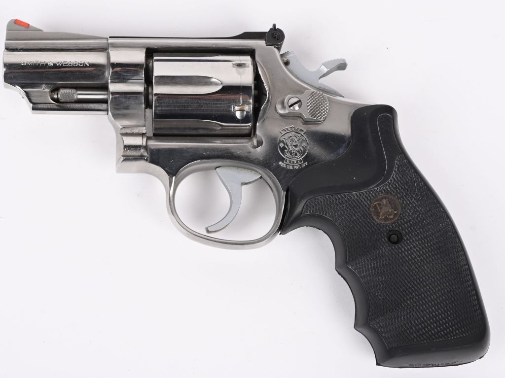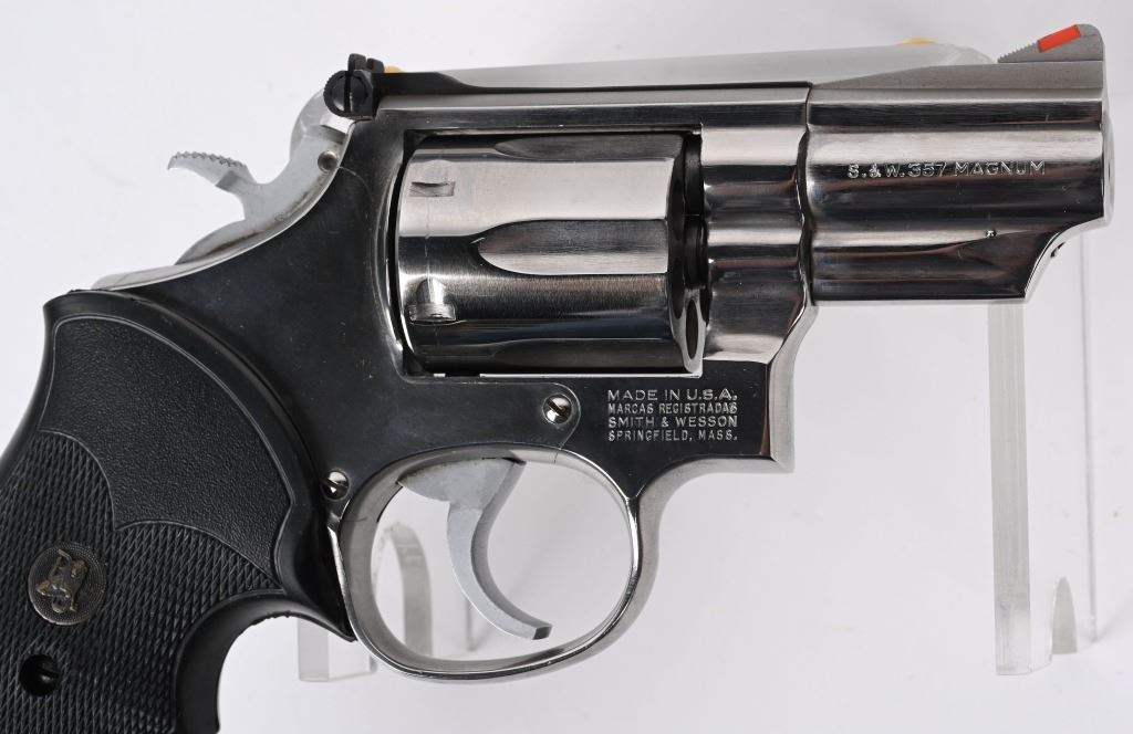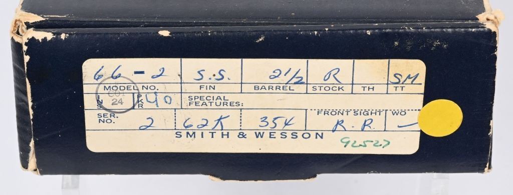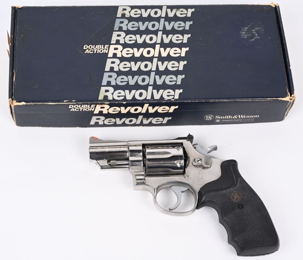 SERIAL NUMBER: 262K354. BARREL: 2-1/2". CALIBER: .357 MAGNUM. MANUFACTURED: 1982. Standard markings and features. Six shot fluted cylinder. Ramped blade front sight and adjustable u-notch rear. Round butt frame. Polished stainless finish. Pachmayr checkered rubber grips. Includes original box, being matched to the gun. CONDITION: Metal is excellent overall, with minor scratches and handling marks. Grips are excellent. Shiny bore with strong rifling. Crisp mechanics. Box has exterior wear. MODERN
