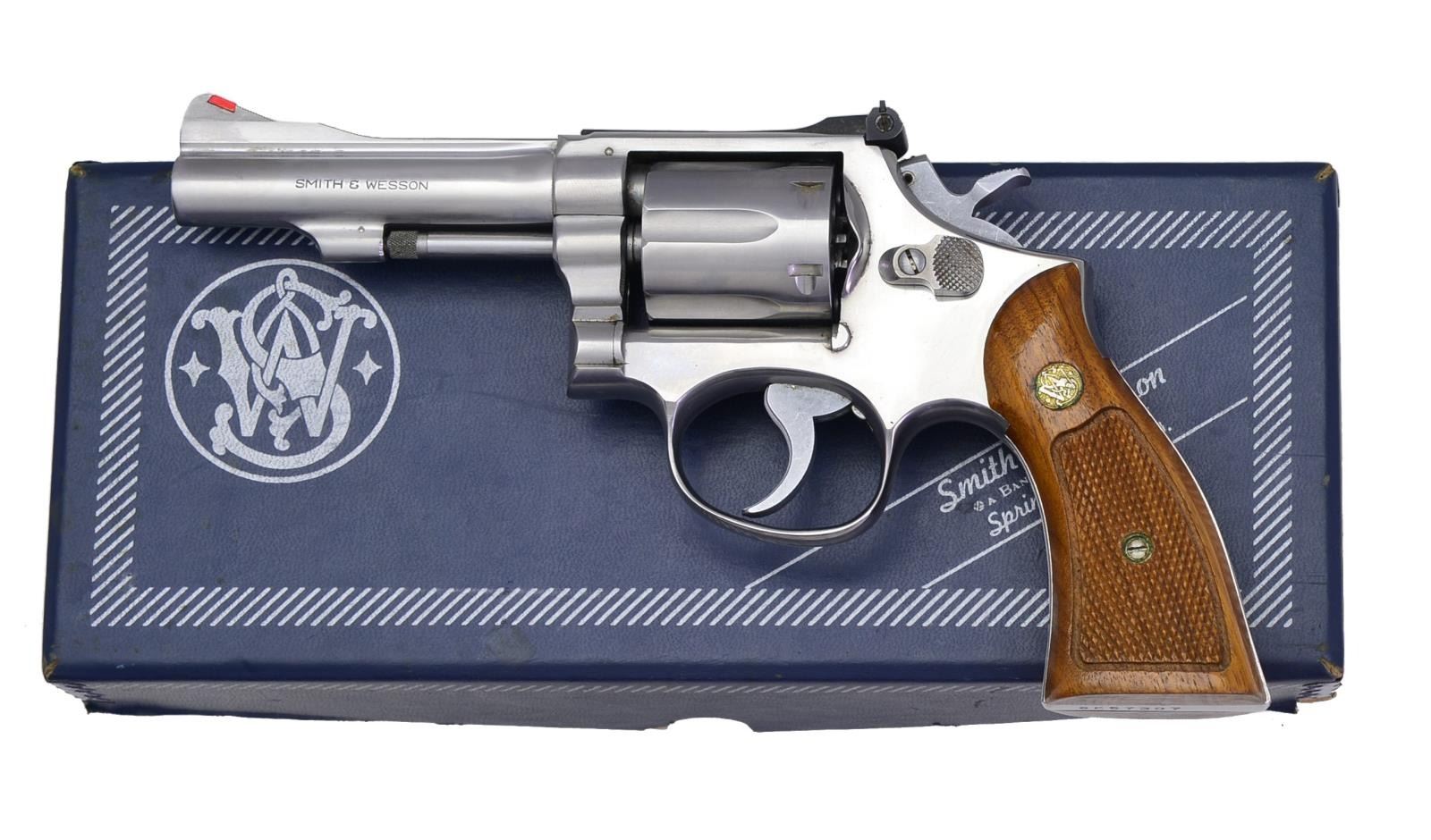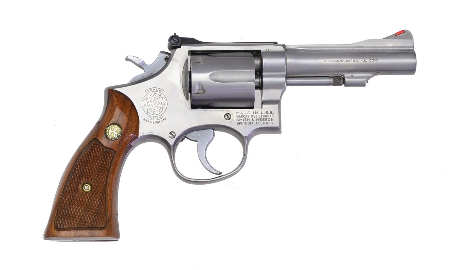 REVOLVER. Cal. 38 Spl. S# 6K57307. Bbl. 4" rnd. w/ rib. Serrated red ramp front sight w/ square notch adj. rear sight. 6 Shot fluted cyl. Stainless steel construction. 2 Piece checkered walnut Magna grips w/ S&W medallions. UNATTACHED ACCESSORIES: 2 piece box w/ proper label. CONDITION: very good stainless finish showing a slight cyl. drag line. Very good grips. Bright near excellent bore. (20-3643/DS). MODERN. $500-700.