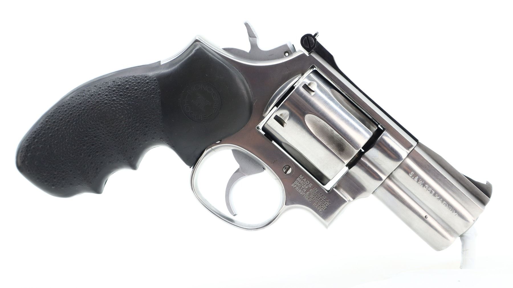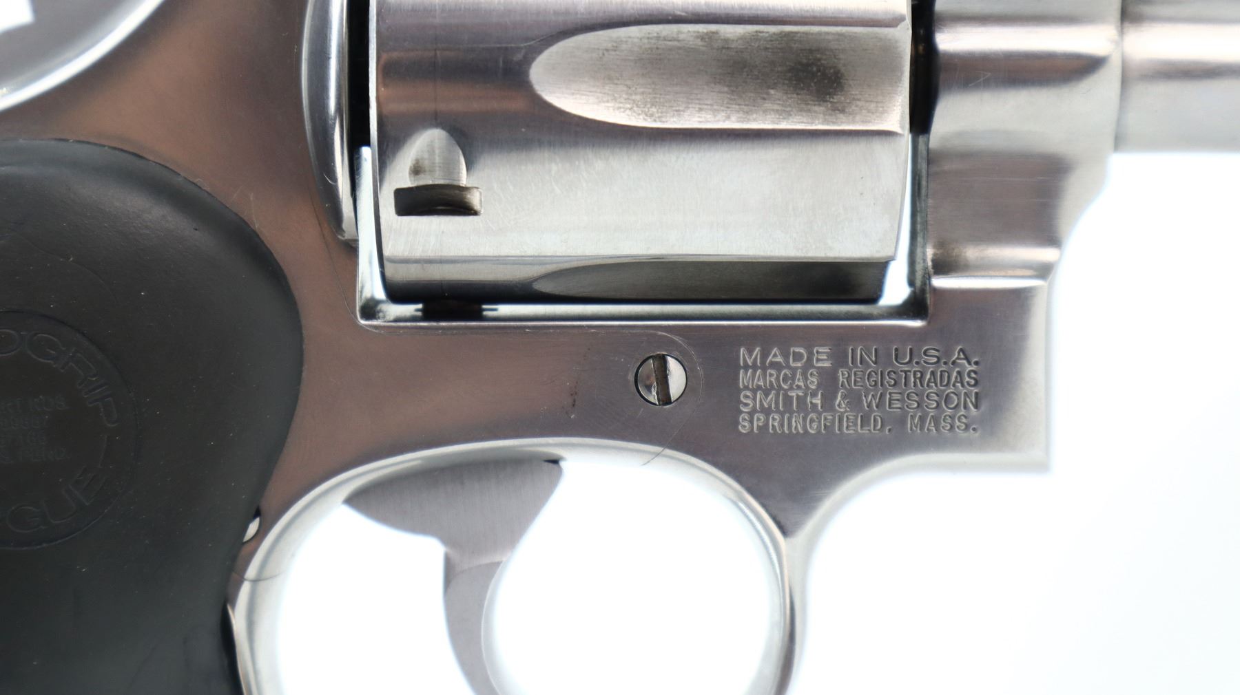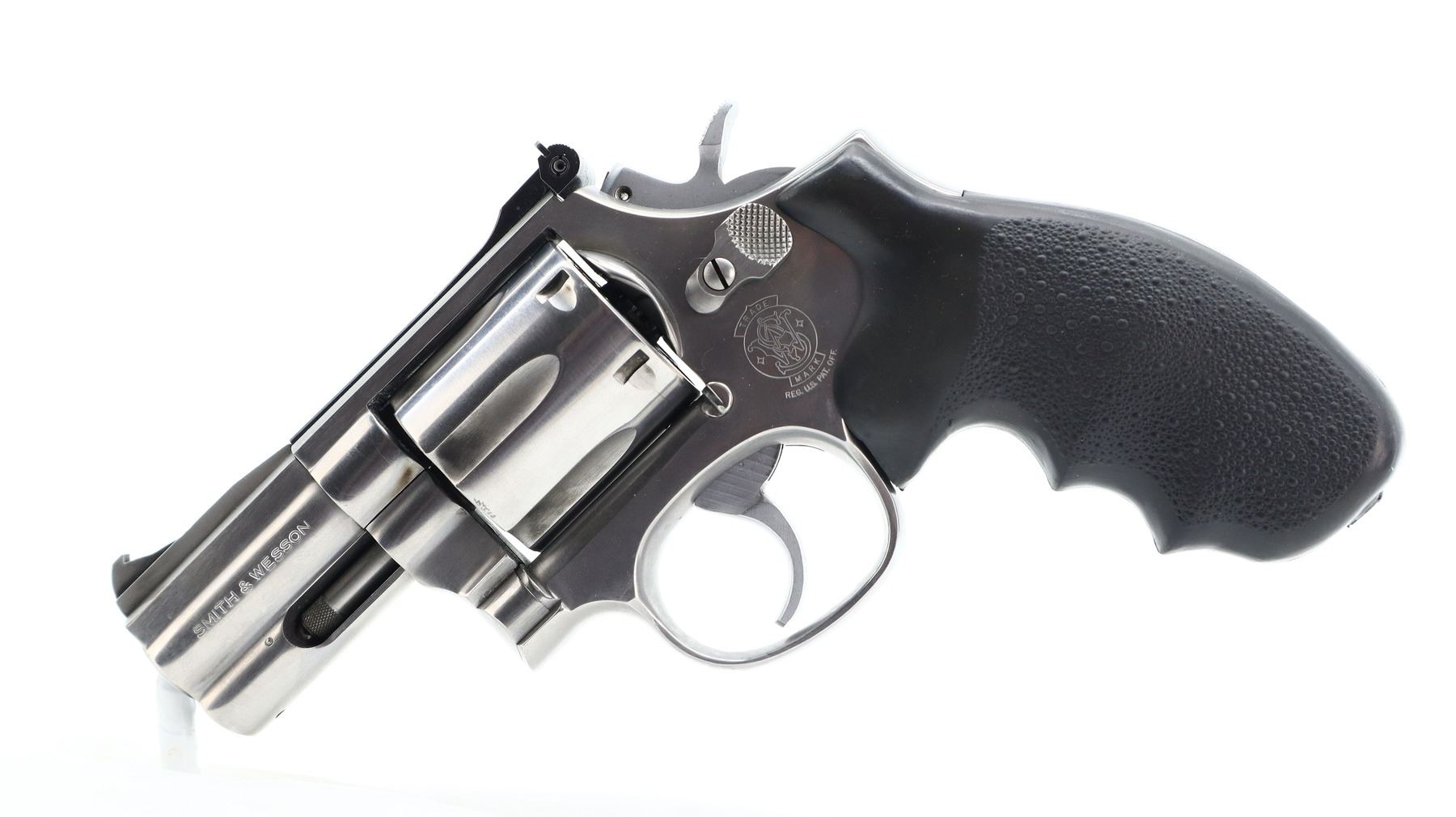 SMITH & WESSON, MODEL: 686-2, CALIBER: 357 MAG, BORE IS VERY GOOD, SHINY. FUNCTIONS MECHANICALLY AS DESIGNED. BLADE FRONT SIGHT WITH RAMP (MODIFIED), ADJUSTABLE U NOTCHED REAR SIGHT, STAINLESS FINISH, CHECKERED SPURR HAMMER AND SMOOTH TRIGGER. ONE PIECE TEXTURED BLACK RUBBER HOGUE GRIP WITH FINGER GROOVES, FULL UNDER LUG. METAL FINISH SHOWS SOME SCRATCHES, HANDLING MARKS AND WEAR. GRIPS SHOW SOME MARKS AND SCRATCHES. , ACTION: REVOLVER, BARREL LENGTH: 62MM, SERIAL # BAF4247, CONDITION: 7+/10 CLASS:CANADIAN 12-6 PROHIBITED