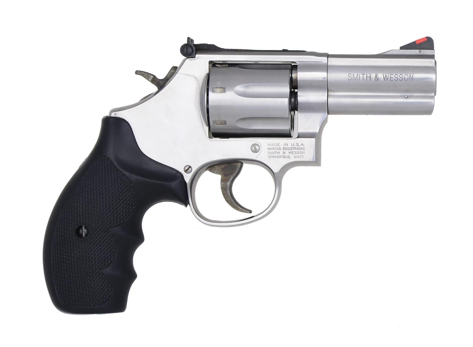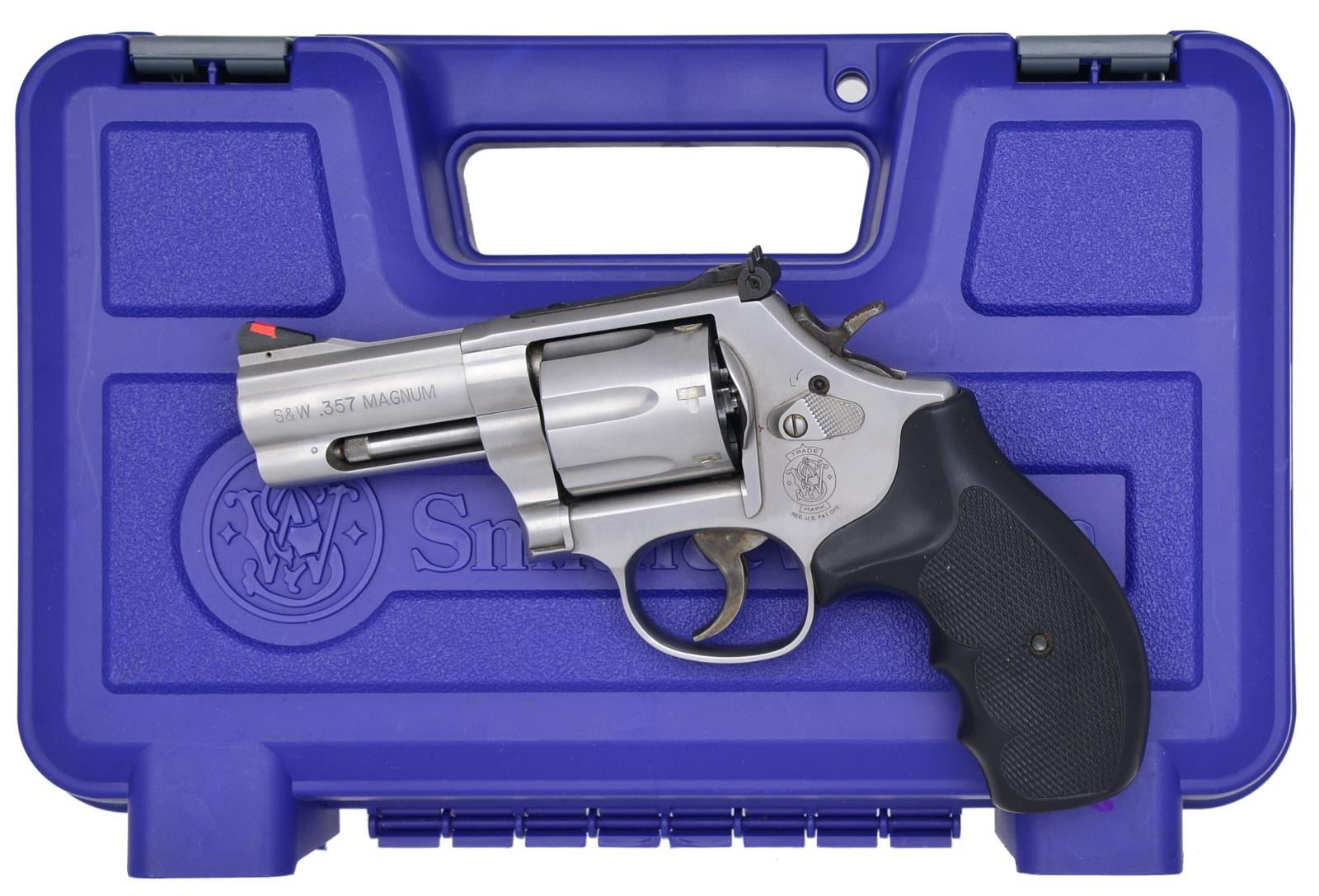 Cal. 357 Mag. S# DCD 7828. Bbl. 3" full lug w/ blued red insert Baughman blade plus white outline Micrometer rear. Mfg. post 2017 as Plus Deluxe L frame having 7 rd. fluted cyl. w/ key lock & cyl. latch relieved for speed loaders. Finger grooved, checkered rubber combat grip. Case colored hammer & smooth faced trigger. UNATTACHED ACCESSORIES: factory blue case & packaging. CONDITION: very faint cyl. turn line. Cyl. face indicates only 3 chambers have been fired as when testing at factory. All other aspects near excellent appearing new. PROVENANCE: The Estate of Richard Willman. (20-2363/NW). MODERN. $600-850.