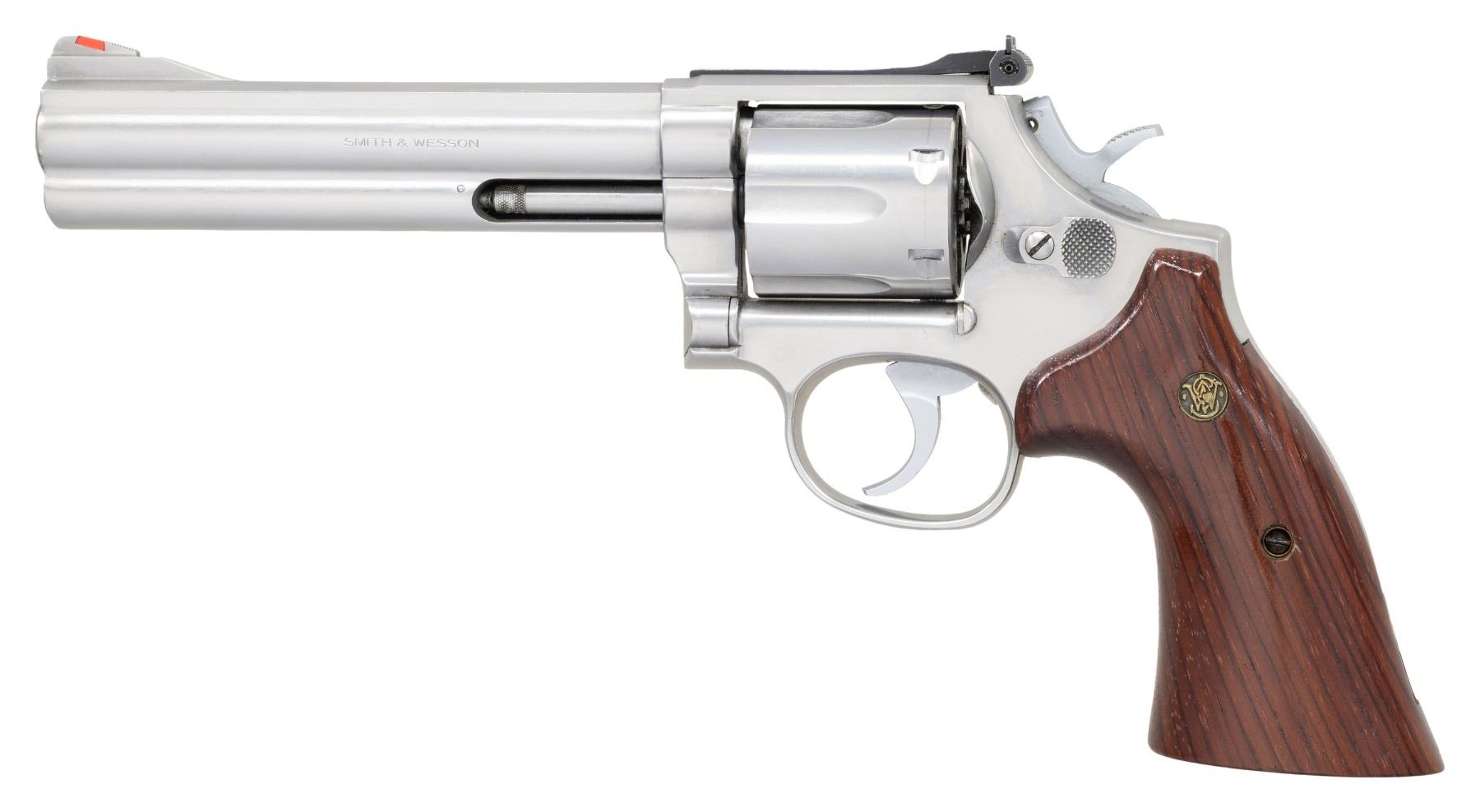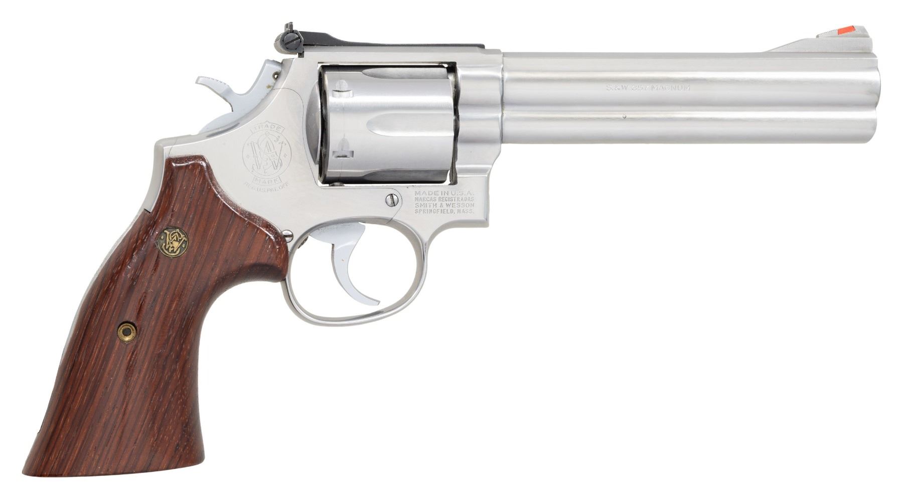 Cal. 357 Mag. S# AAB6921. Bbl. 6" with full underlug. Ramped serrated blade front sight with red insert. Adjustable square notch rear sight with white outline. No-dash 686 revolver with 6-shot cyl. Stainless finish with hard chrome trigger & hammer. Smooth target grips with silver S&W medallions. CONDITION: grips have added varnish with some flaking & handling marks. Metal appears mostly bright with some handling marks & operational wear. Action functions properly when hand cycled. Bright near excellent bore. (25-3946/MJC). MODERN. $500-800.