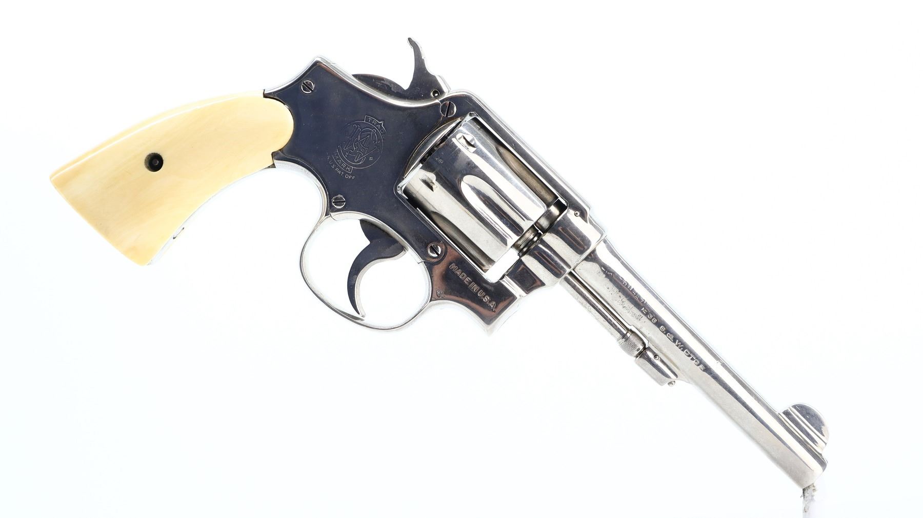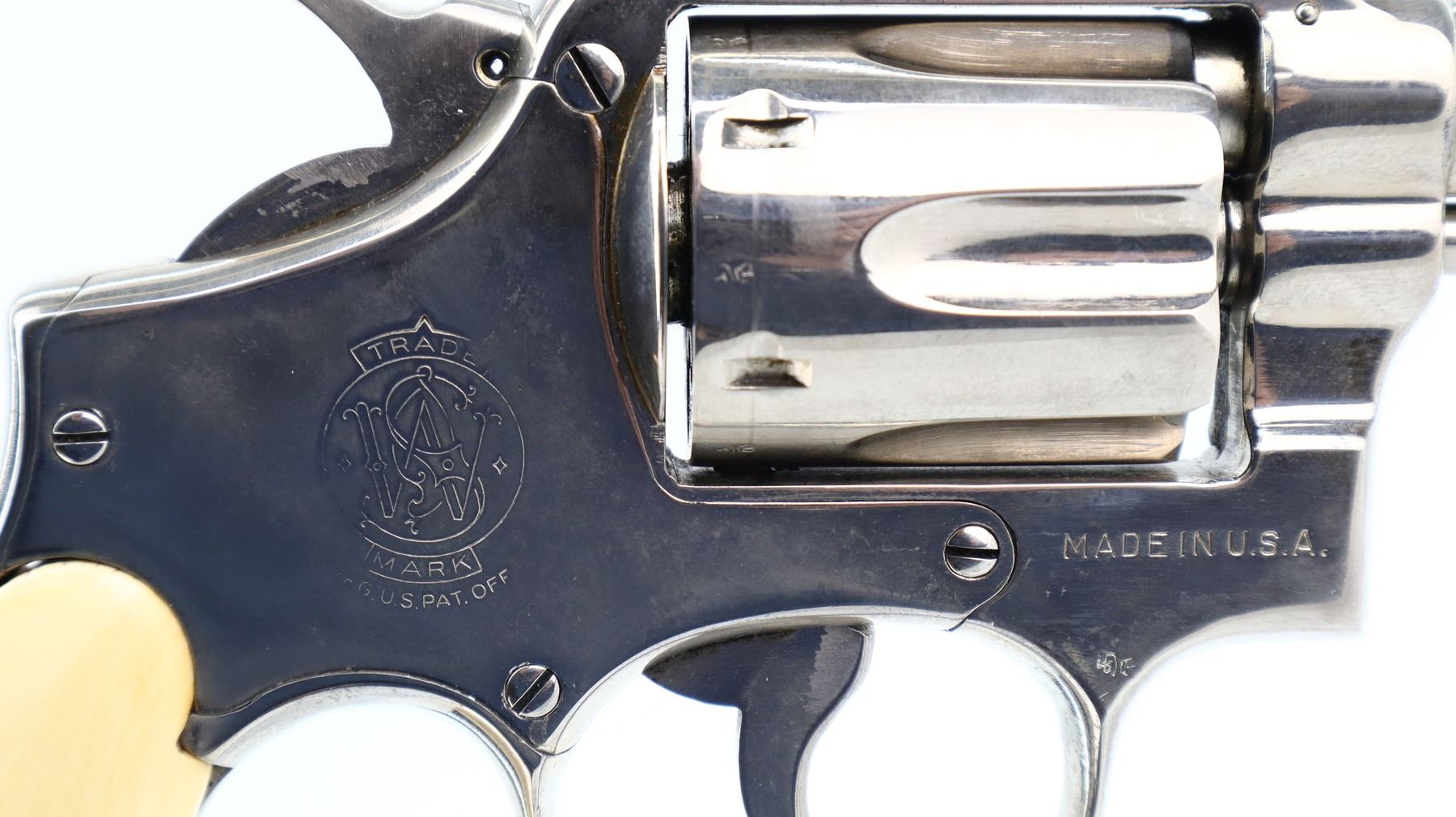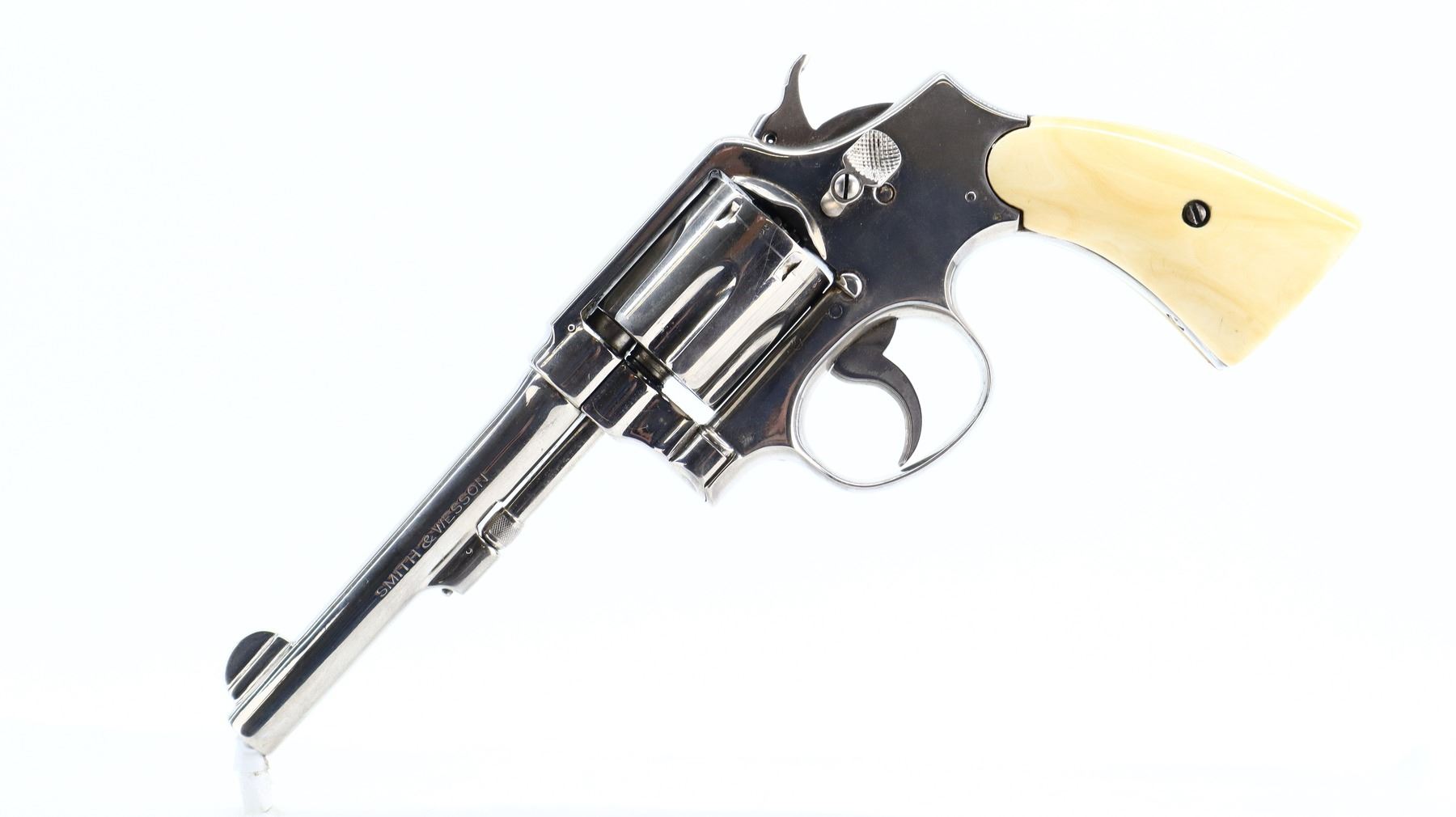 5/10 , SMITH & WESSON , MODEL: HAND EJECTOR 38 MILITARY AND POLICE MODEL 3 OF 1905 CHANGE 4 , CALIBER: 38 S& W. BORE IS FAIR. FUNCTIONS MECHANICALLY AS DESIGNED. FAINT NUMEROUS MILITARY MARKINGS UNDER THE NICKEL PLATING. BLADE FRONT SIGHT, NOTCHED REAR SIGHT. IVORY GRIPS, RE-NICKELLED FINISH. METAL FINISH SHOW SOME SCRATCHES, HANDLING MARKS AND WEAR. GRIPS SHOW SOME SCRATCHES.. ACTION: REVOLVER. BARREL LENGTH: 127MM. SERIAL # 924464. CONDITION: 5/10. CLASS: CANADIAN RESTRICTED CLASS