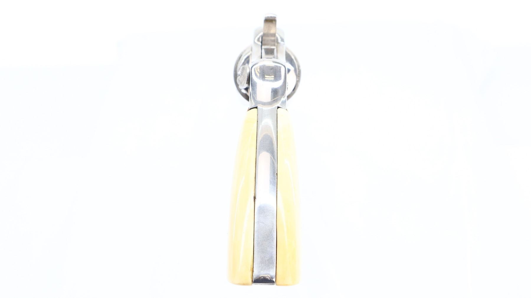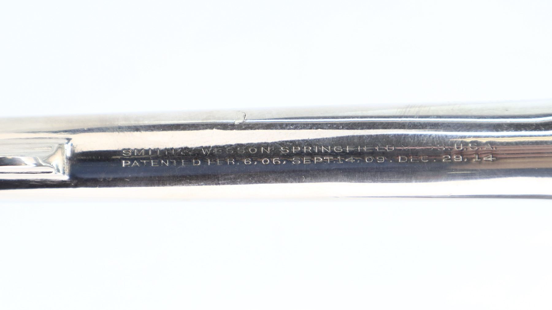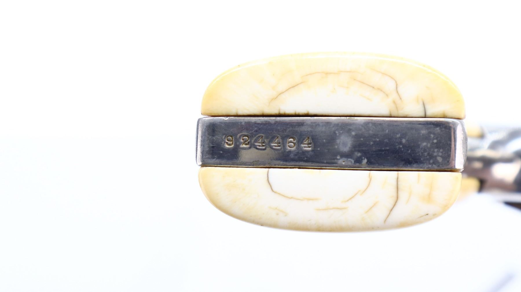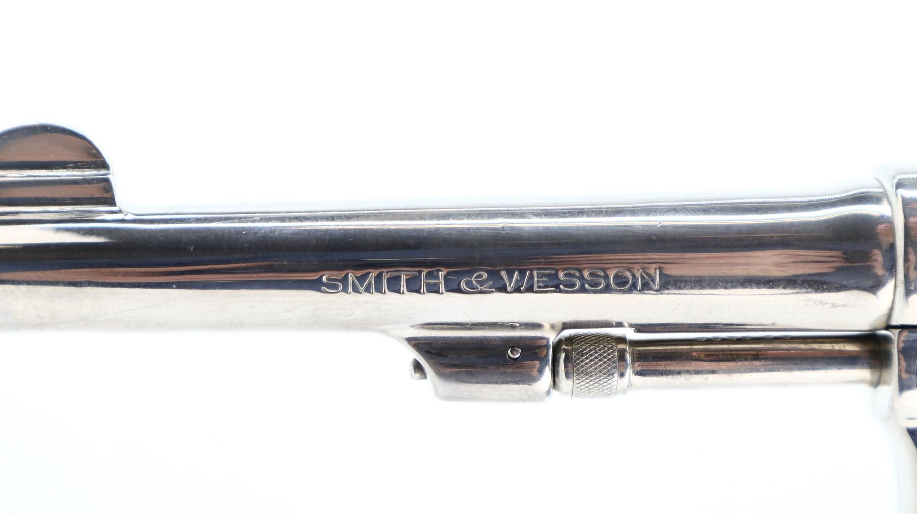 5/10 , SMITH & WESSON , MODEL: HAND EJECTOR 38 MILITARY AND POLICE MODEL 3 OF 1905 CHANGE 4 , CALIBER: 38 S& W. BORE IS FAIR. FUNCTIONS MECHANICALLY AS DESIGNED. FAINT NUMEROUS MILITARY MARKINGS UNDER THE NICKEL PLATING. BLADE FRONT SIGHT, NOTCHED REAR SIGHT. IVORY GRIPS, RE-NICKELLED FINISH. METAL FINISH SHOW SOME SCRATCHES, HANDLING MARKS AND WEAR. GRIPS SHOW SOME SCRATCHES.. ACTION: REVOLVER. BARREL LENGTH: 127MM. SERIAL # 924464. CONDITION: 5/10. CLASS: CANADIAN RESTRICTED CLASS