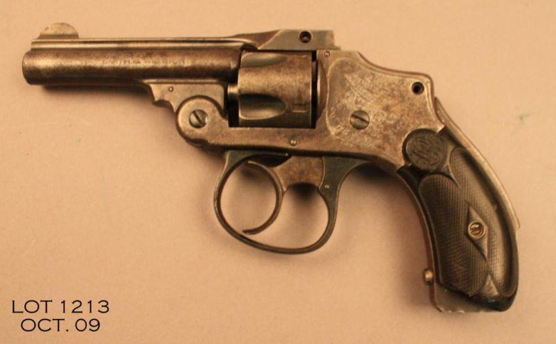 SMITH & WESSON Model 1 ½, # 242530, .32 S&W cal.,  3” barrel, blued finish, hard rubber grips.   Pistol is in fair condition, missing a side plate  screw and the top break latch.  Approximately  20-30% original finish, mainly in the protectedareas, left grip panel has a large piece missing  from the bottom of the panel.  Est. $50-$100.