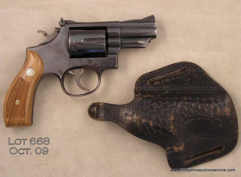 SMITH & WESSON Model 19-3, # K952414, .357 Mag., 2.5” barrel, blued finish, adjustable sights, checkered medallion grips. Retains approximately 90% original finish, evenly thinning and showing losses at the high points. Grips are very good,bore is good. Includes a Tex Shoemaker basket weave concealment holster and a rubber Pachmayr grip. Est. $125-$250.