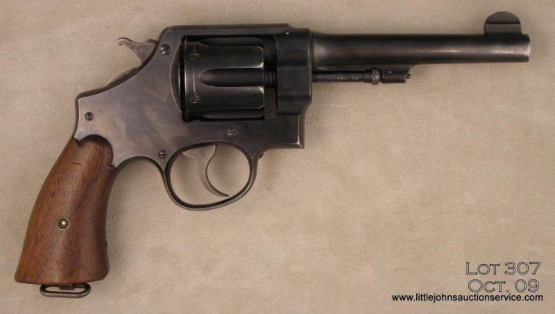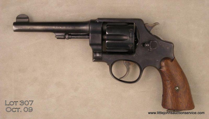 SMITH & WESSON Model 1917 Commercial, # 49369, .45 ACP, 5.5” barrel, blued finish, smooth walnut grips. Revolver is in very good condition overall, showing approximately 90%-95% original blue, thinning at the muzzle and high points.Bore is good, with some areas of pitting, action is tight. Est. $300-$600.