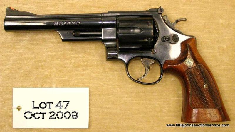 SMITH & WESSON Model 29-3, #AVP7418, .44 Mag., 6” barrel, blued finish, adjustable sights, target hammer and trigger, checkered hardwood grips with medallions. Revolver is in very good condition overall, showing approximately 90%-95% originalfinish, grips are very good with no chips or cracks. Gun would improve with a good cleaning; there is light pin pricking starting from poor storage. Bore is very good and should clean to excellent. Est. $250-$500.